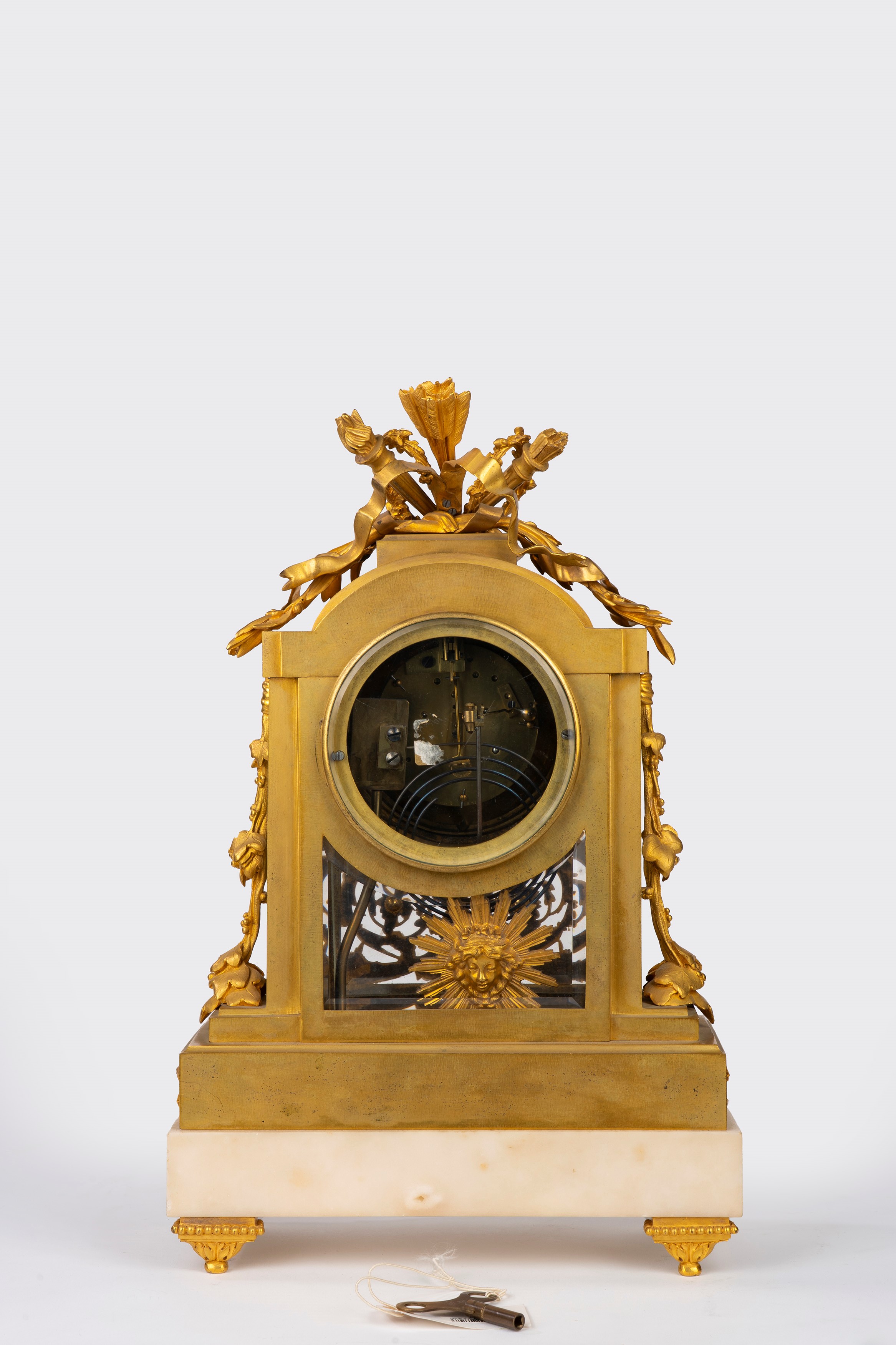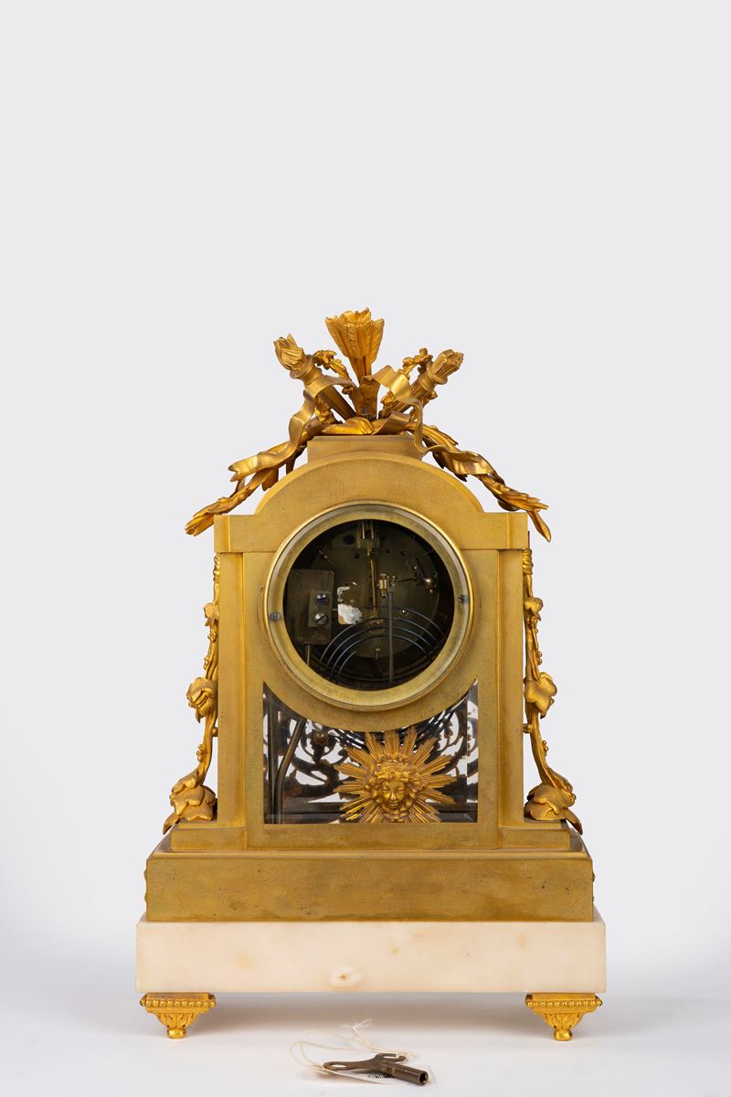 Cassa decorata a volute di foglie e fiori, sormontata da trofeo con fiaccole. Quadrante in smalto bianco a numeri romani per le ore e arabi per i minuti, movimento a due treni di Samuel Marti con lancette dorate e traforate. Iscrizione Antide Janvier/A PARIS sul quadrante.