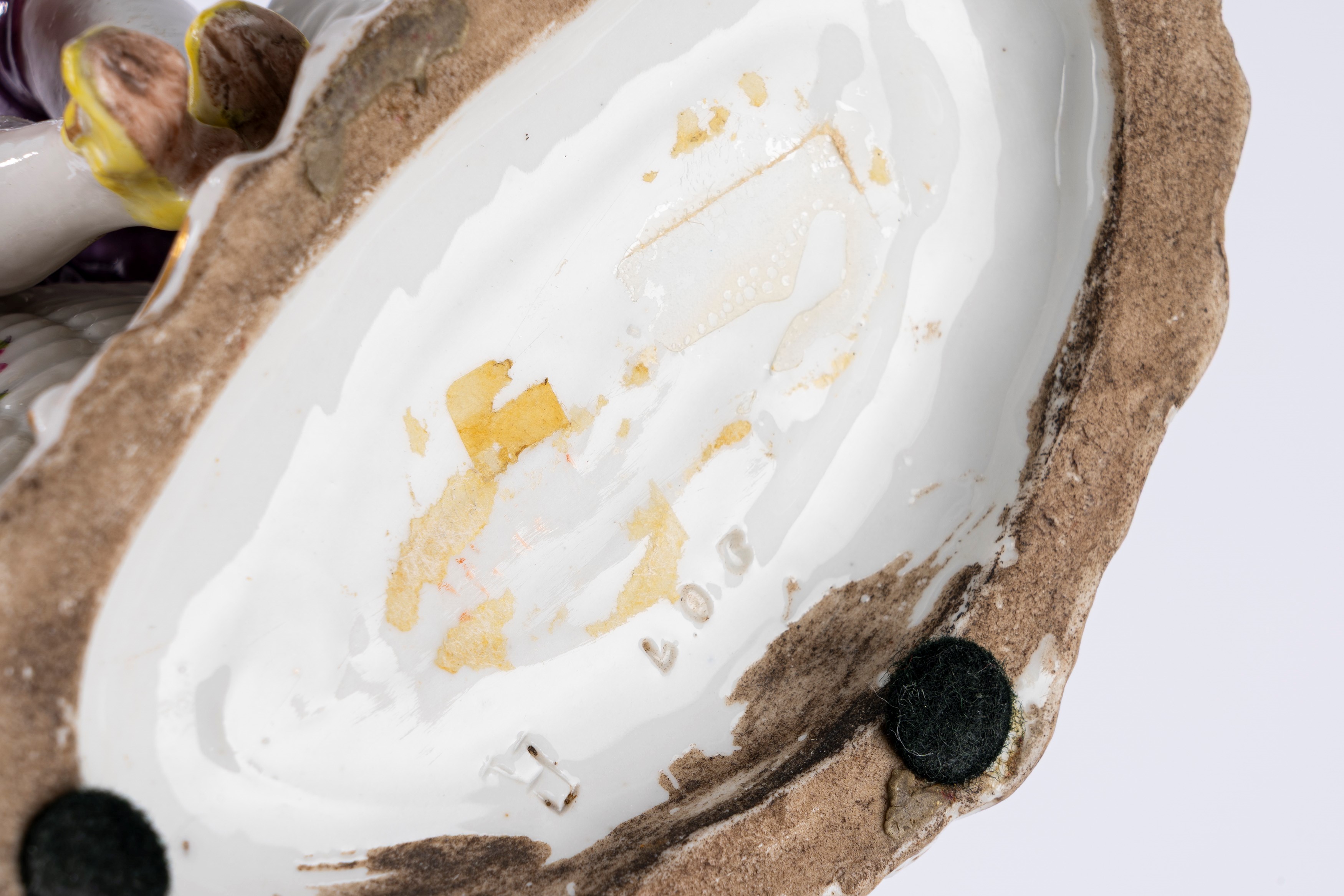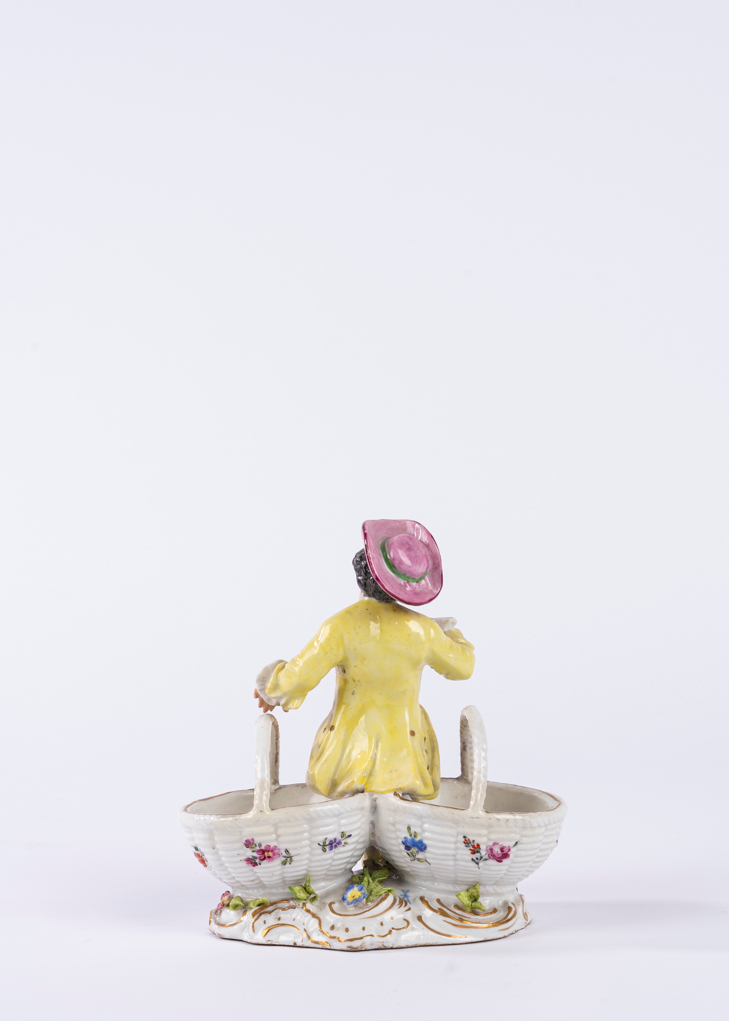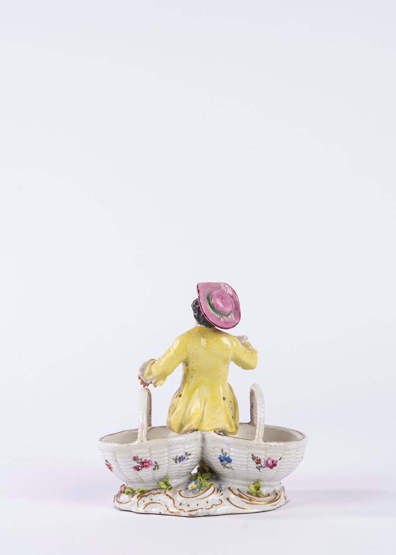 Saliera in porcellana policroma in forma di giovane gentiluomo seduto tra due cestini in finto vimini, su una base a rocaille. Manifattura di Samson, fine secolo XIX.