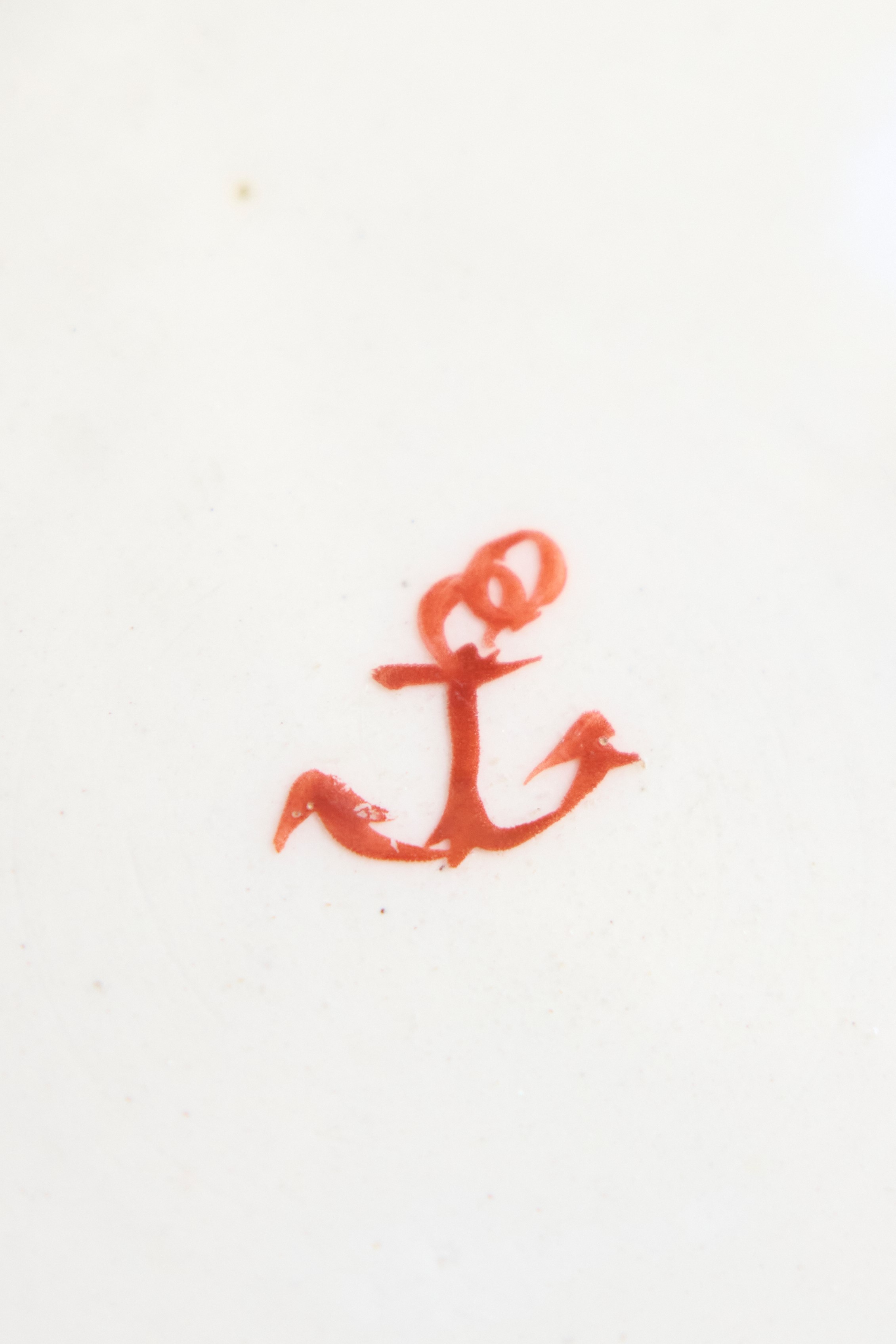 Decoro all’orientale nei toni del blu, del rosso e dell’oro raffigurante un paesaggio lacustre con anatra e, in lontananza, uccelli in volo, caratterizzato da un ponticello che collega due zolle con una pagoda, rocce forate e piante esotiche.