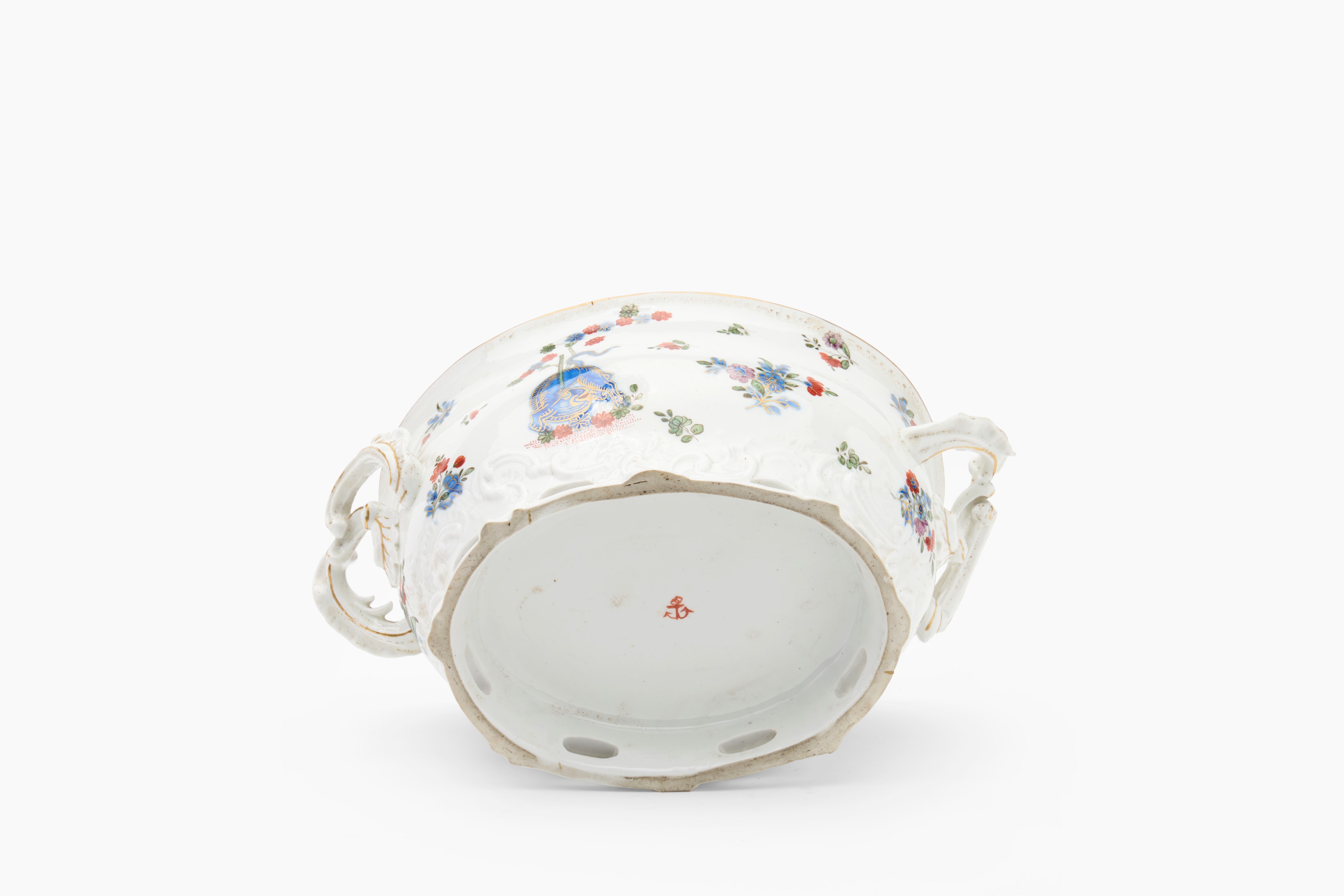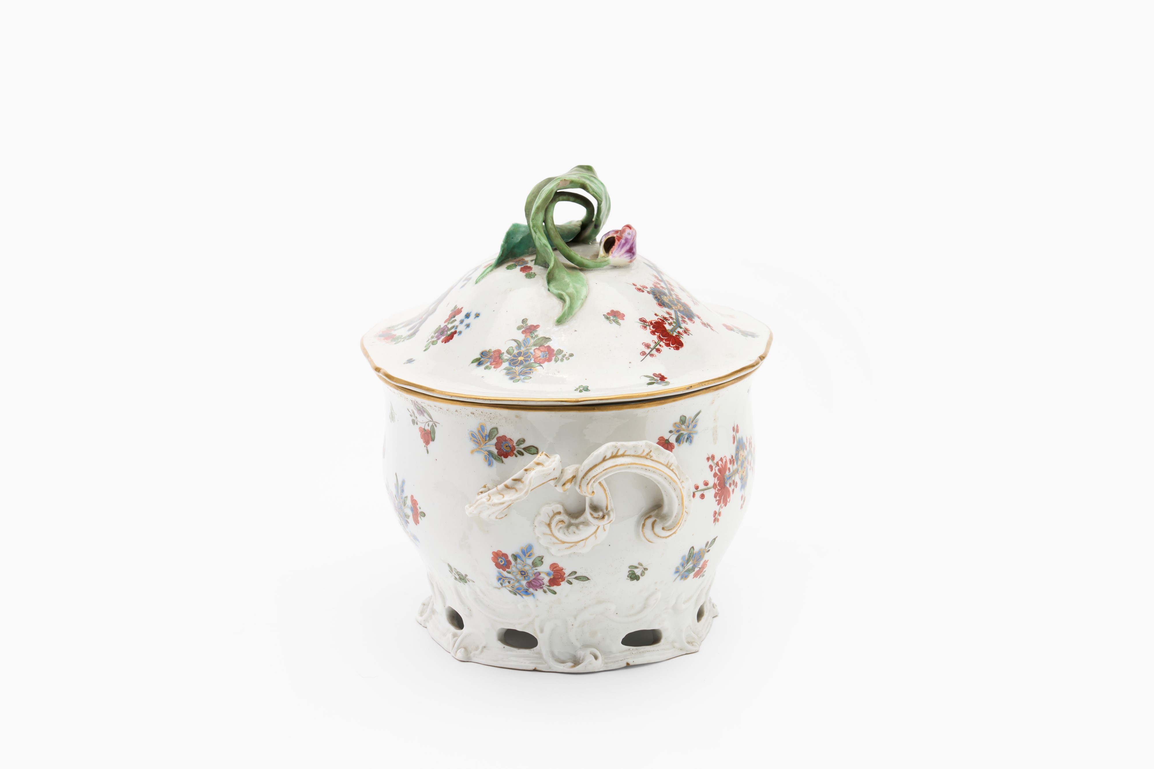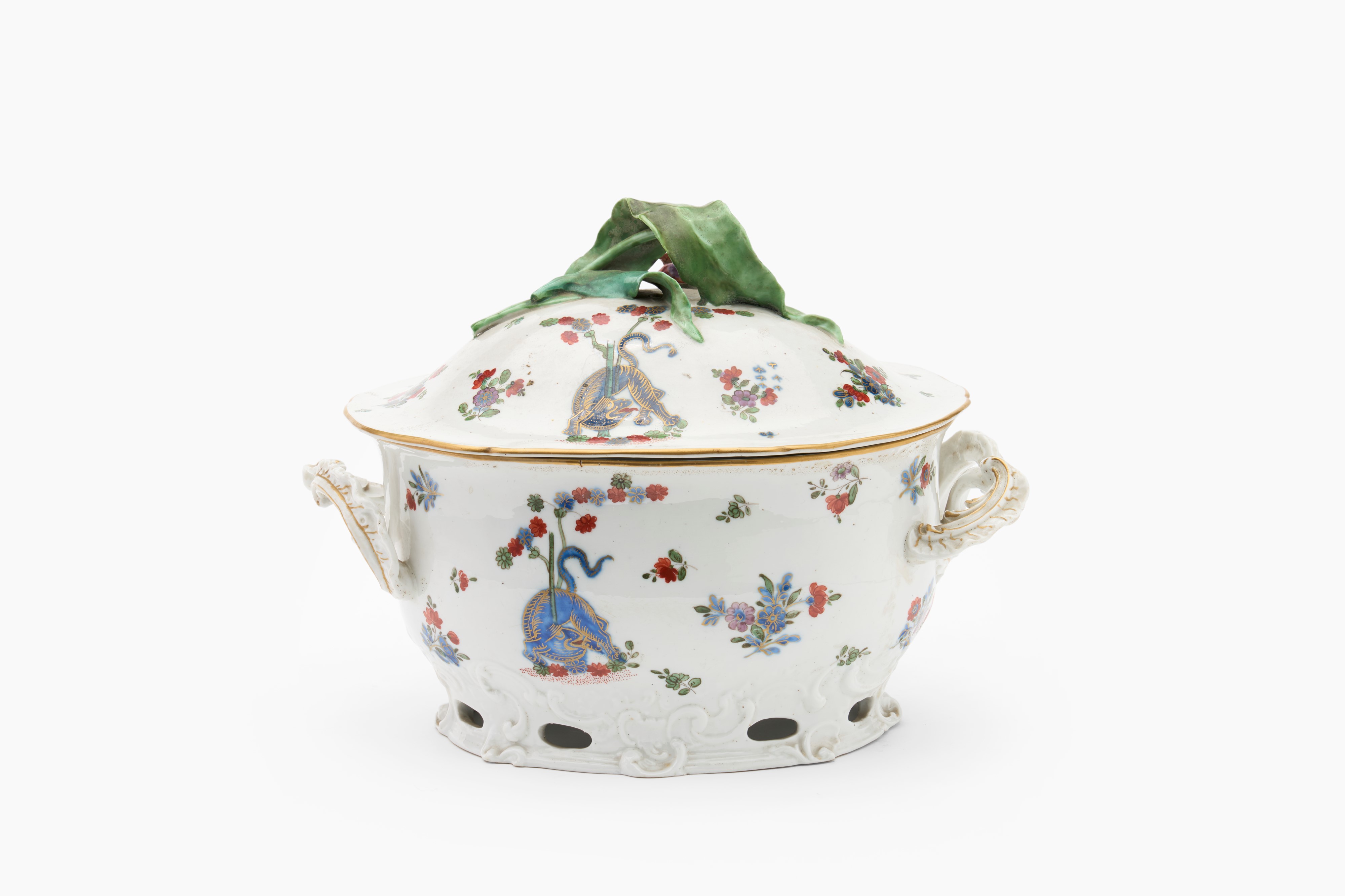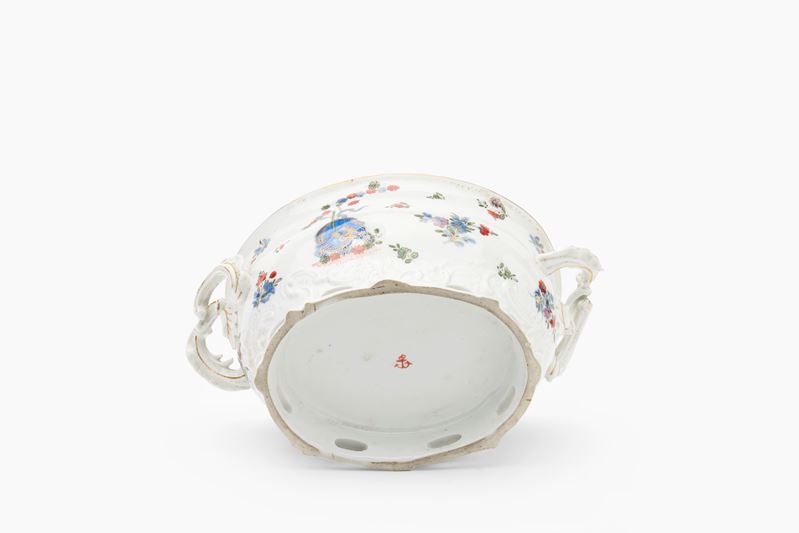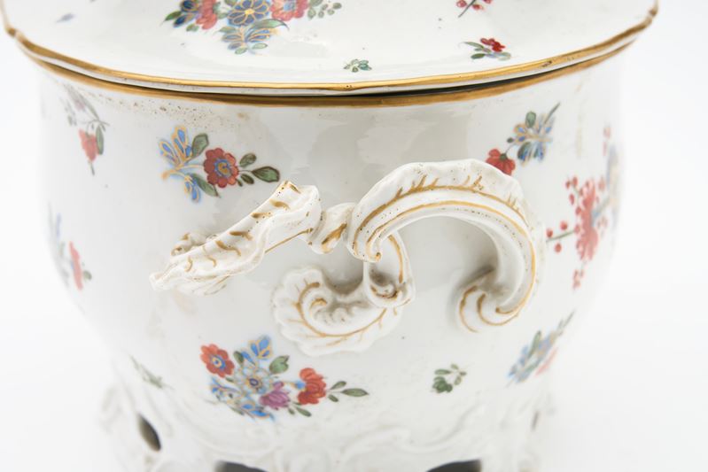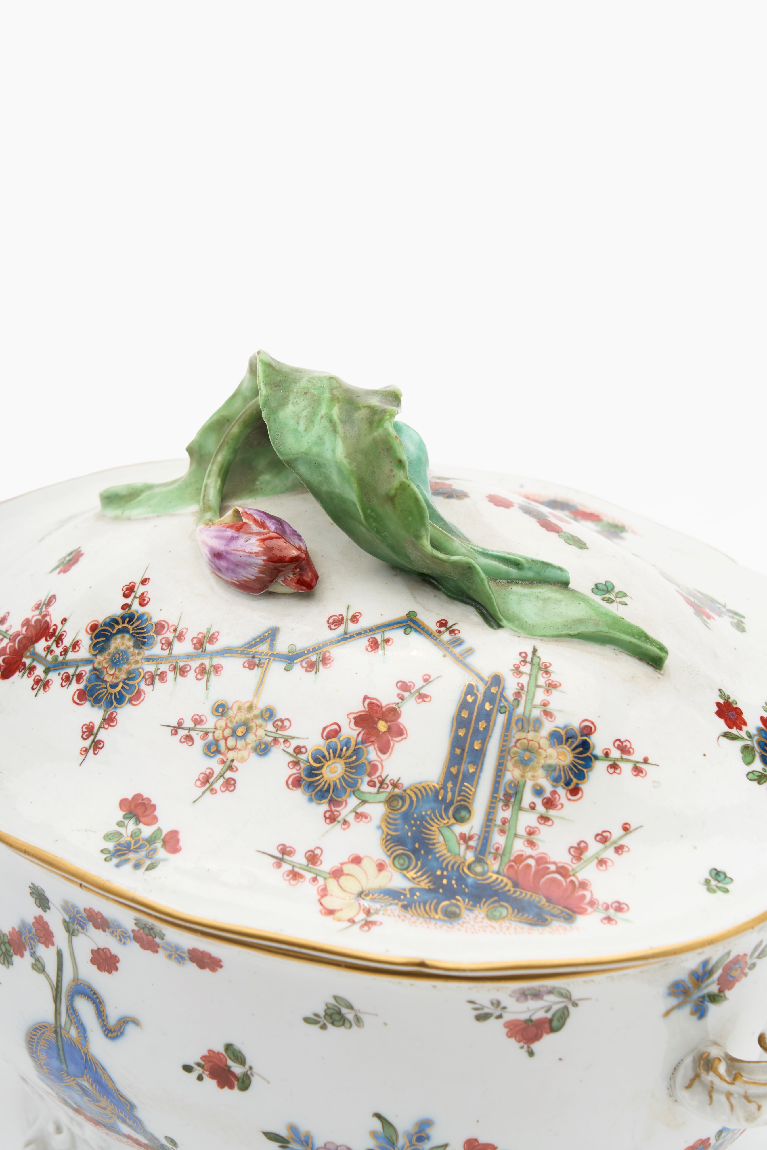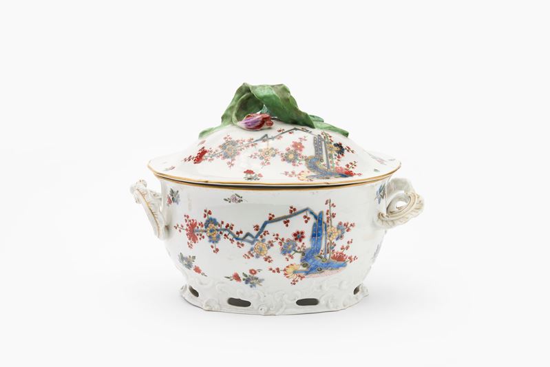 Decoro Kakiemon, anse a volute intrecciate e lumeggiate in oro, base decorata a rilievo e traforata, presa del coperchio a ramo di foglie con un fiore.