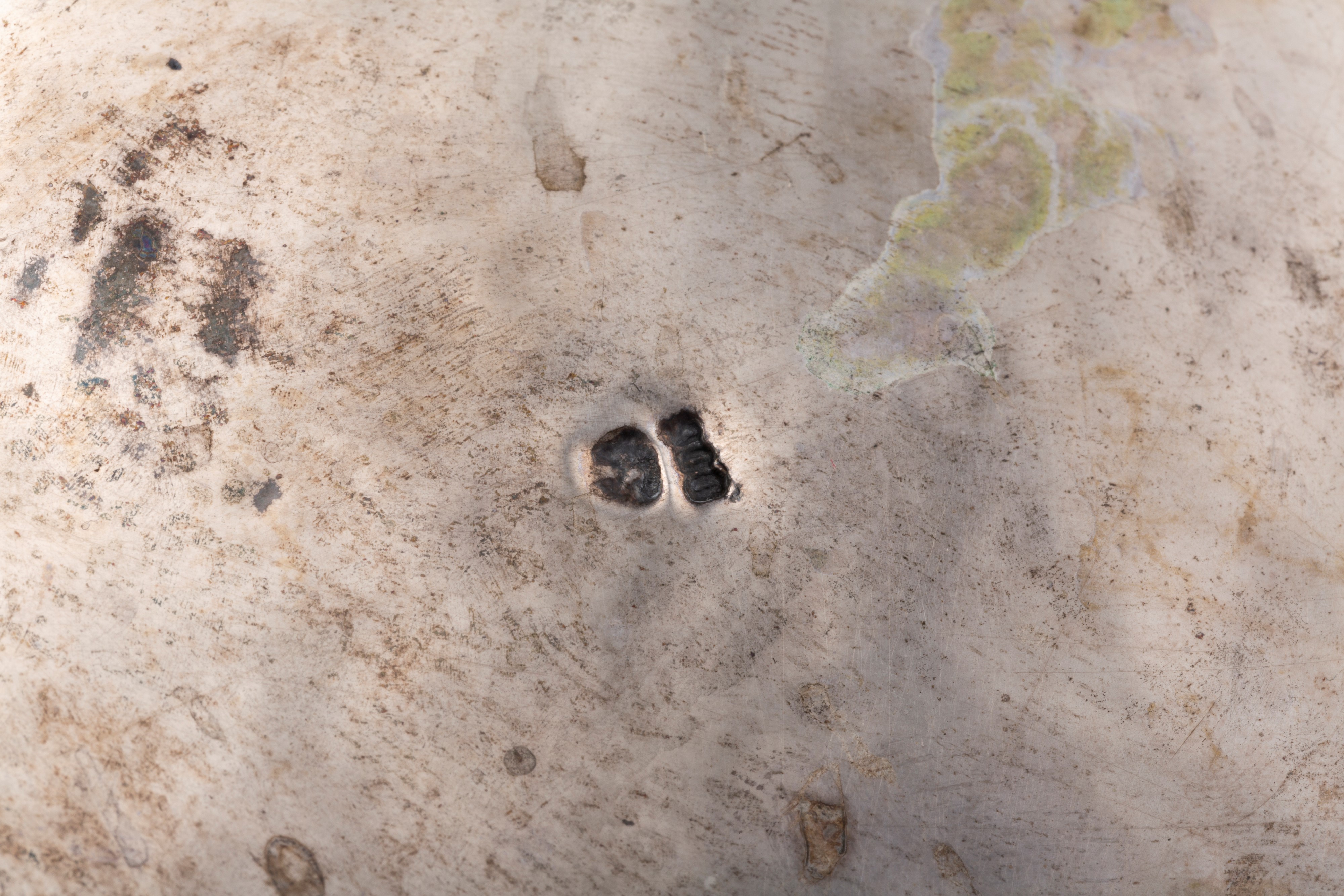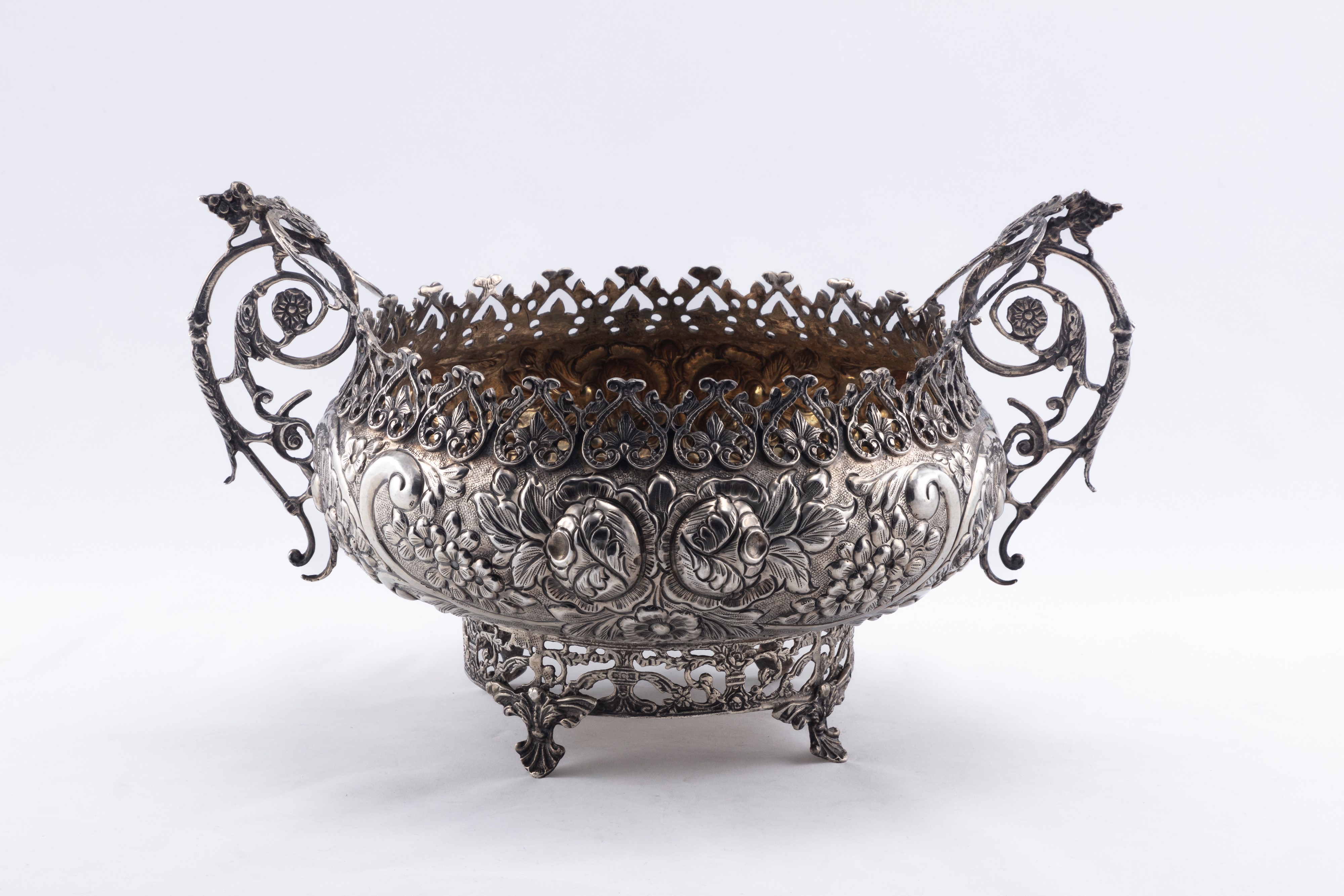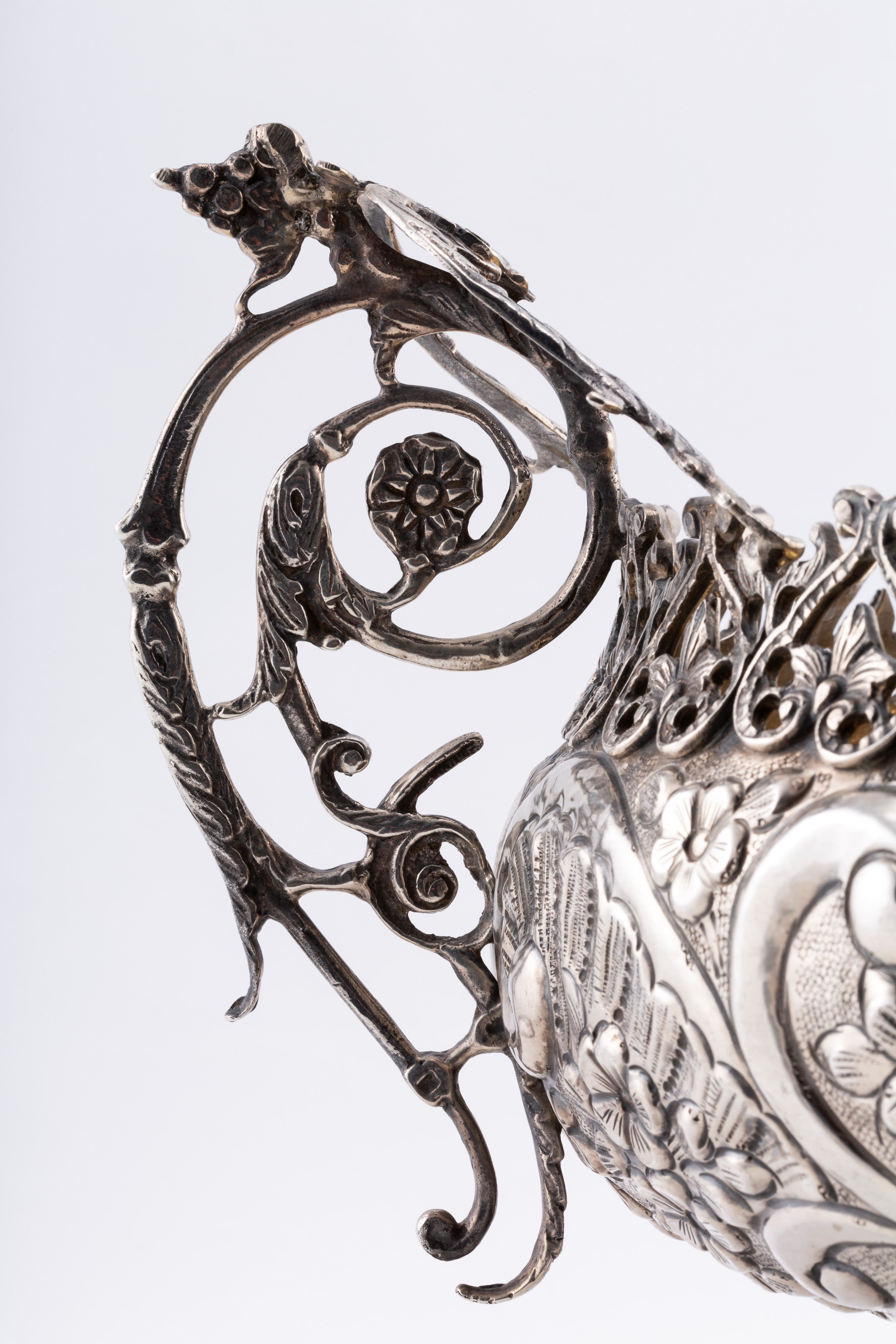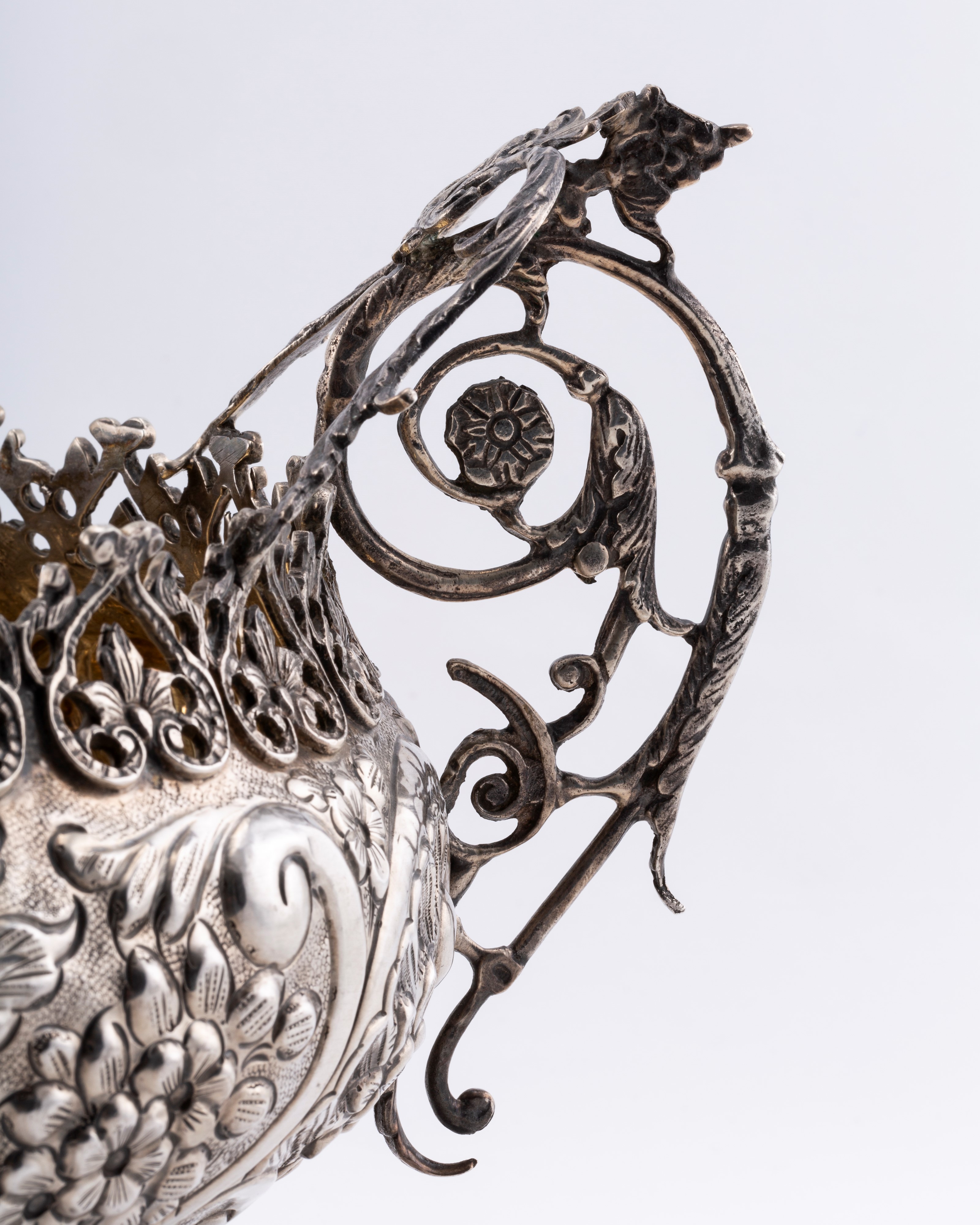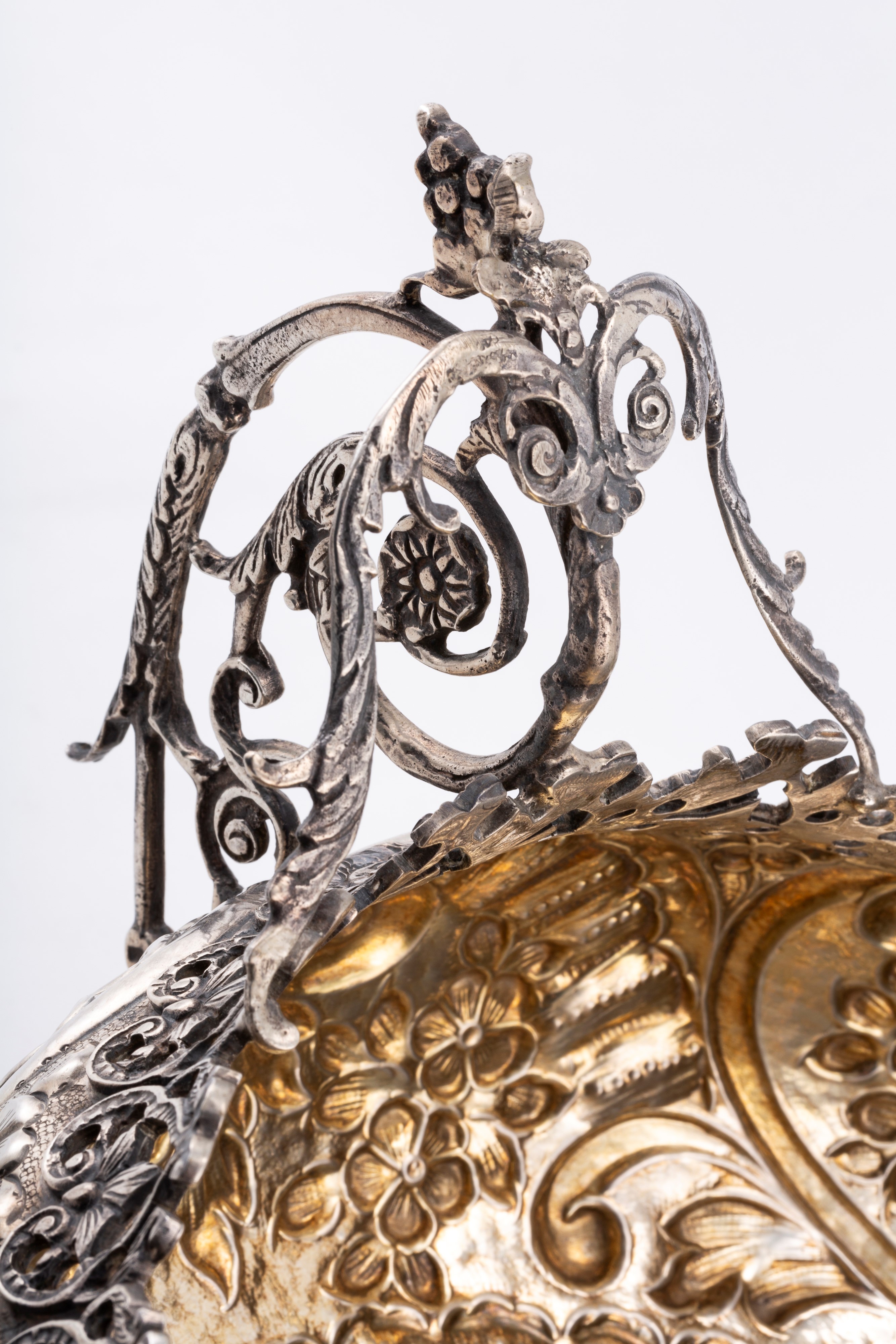 in argento e vermeilbiansato, cesellato e riccamente sbalzato con motivi floreali, poggiante su base circolare decorata con vasi di fiori, sorretta da piedini a valva di conchiglia.