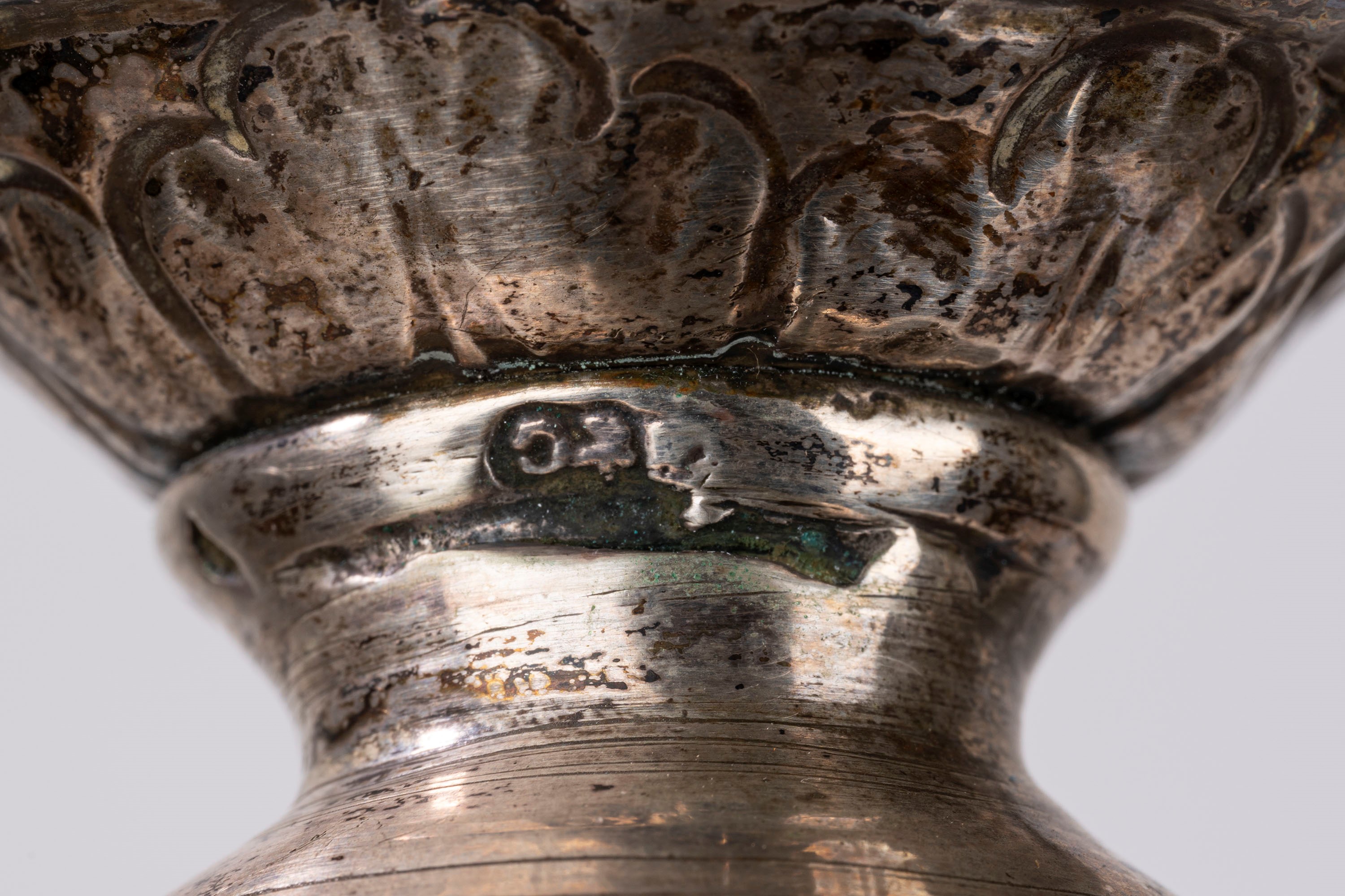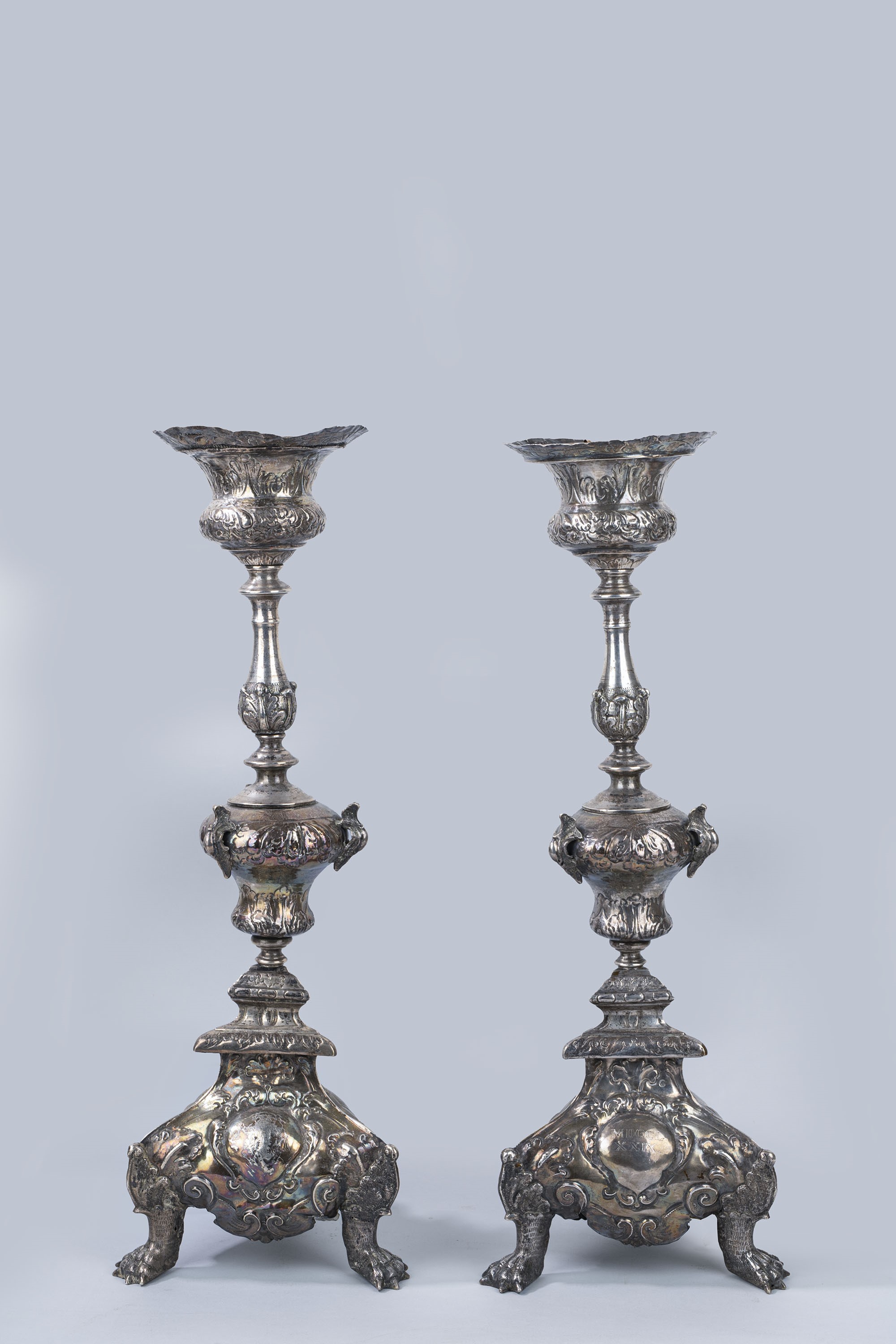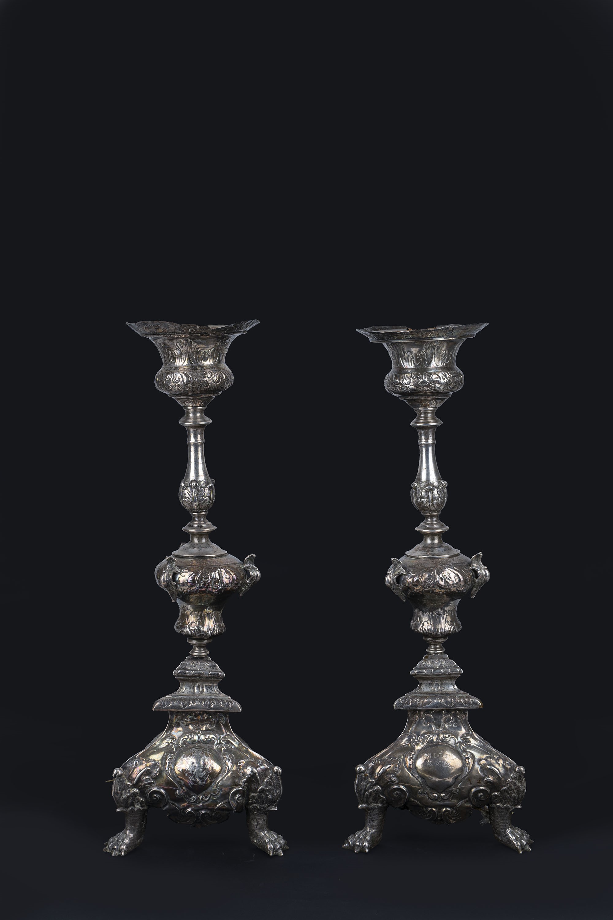 finemente sbalzati e cesellati, la base tripartita su tre piedini ferini è decorata con tre riserve raffiguranti figura di santo, l'incisione "ANNO DNI"e la data "MDCCLXXIX" (1779), il fusto sbalzato a vaso con tre anse, la parte superiore decorata con foglie d'acanto e motivi floreali, montati a luce elettrica, difetti.