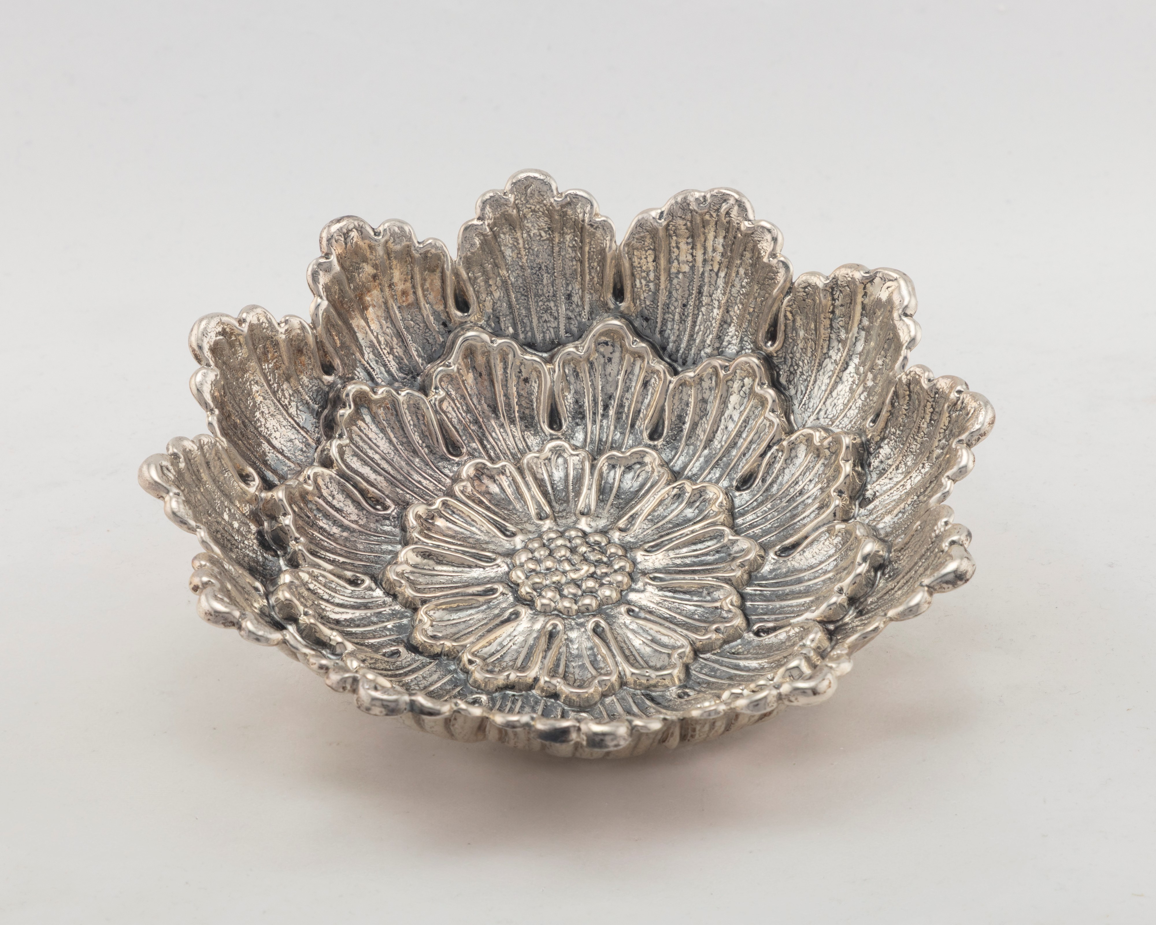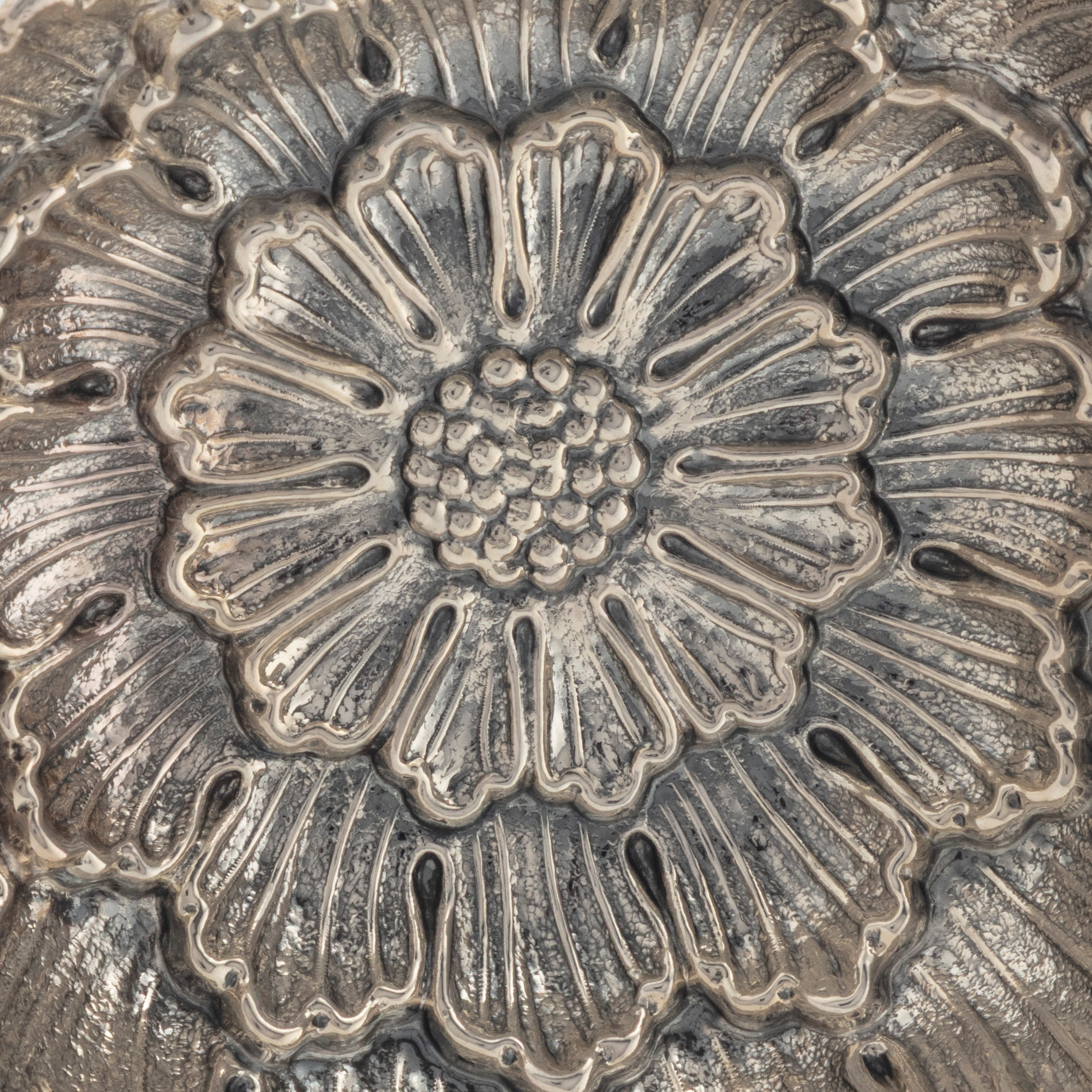 misura grande, finemente sbalzata a foggia di dalia, con scatola.
