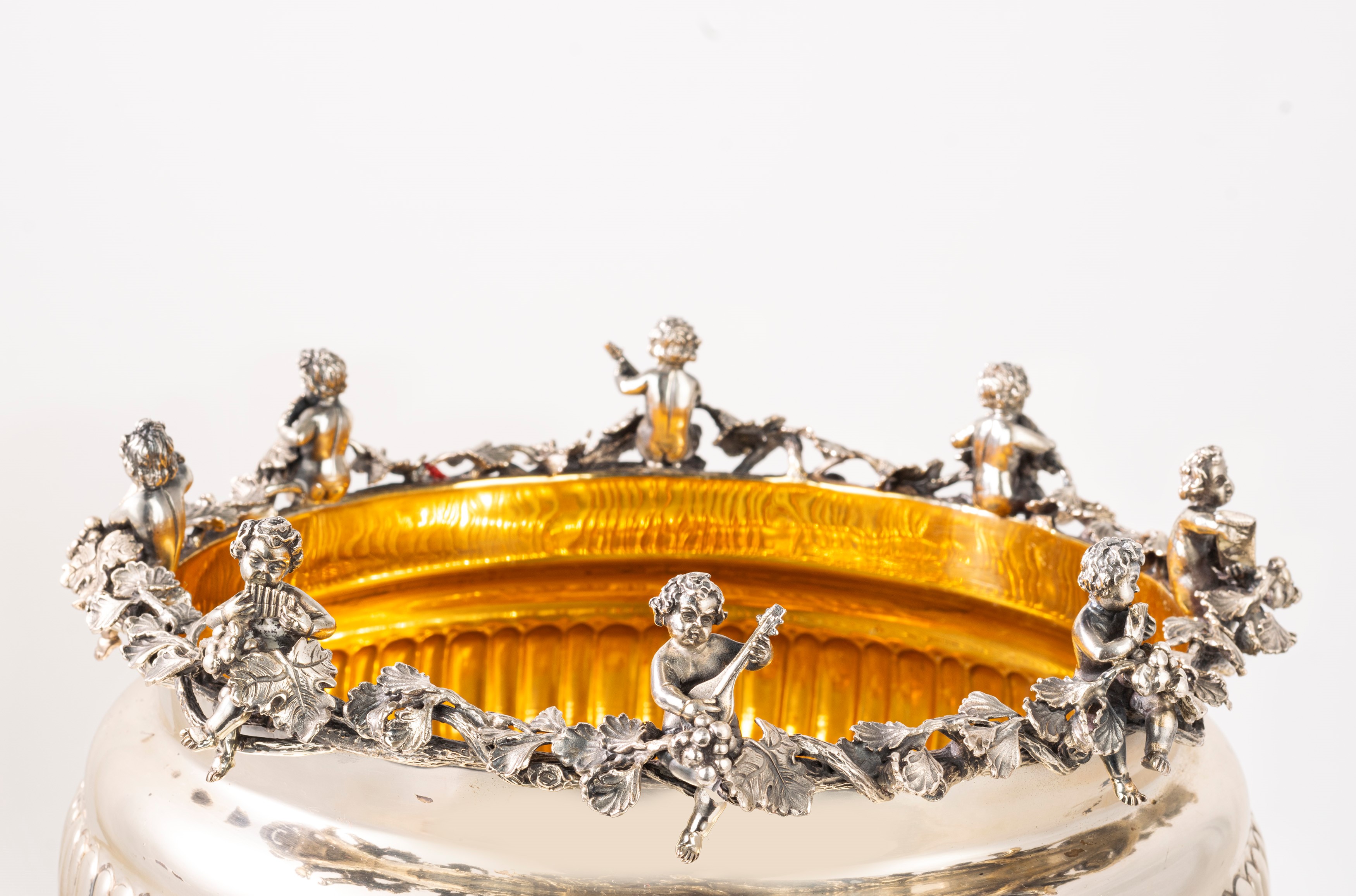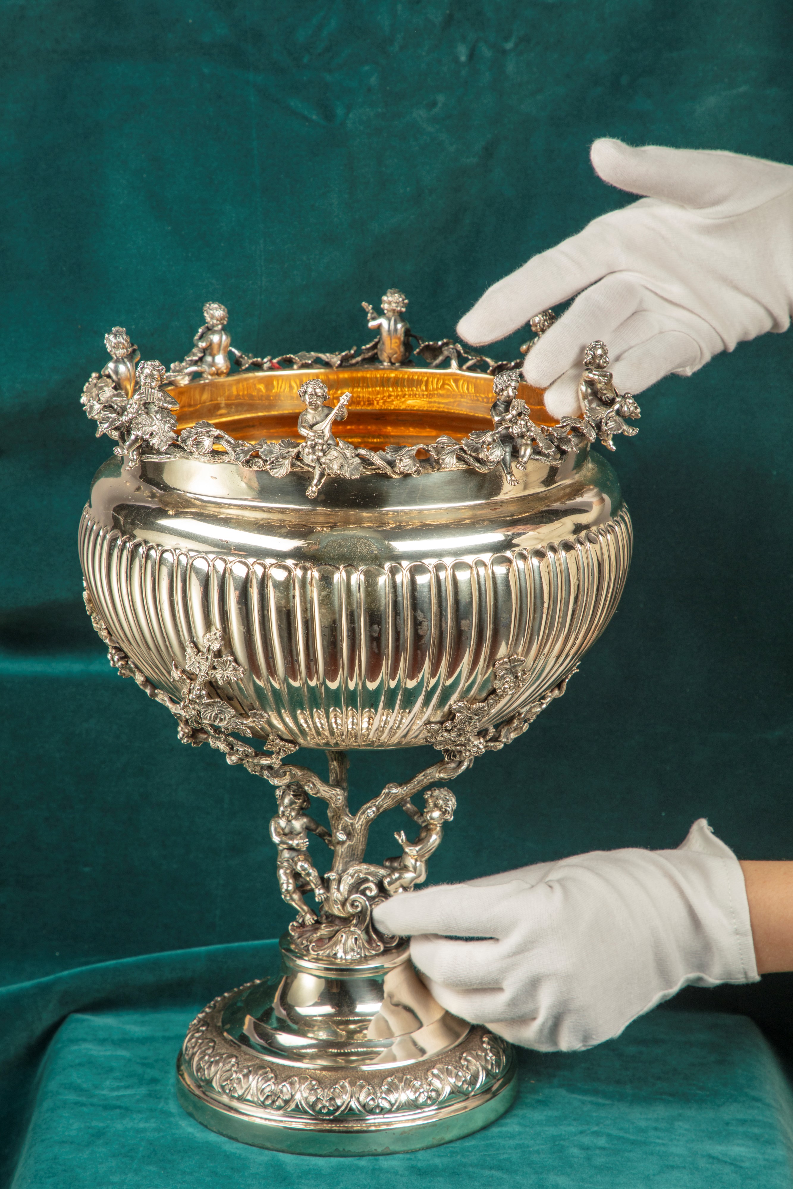 in argento e vermeilfuso, sbalzato e cesellato, la base finemente incisa a volute floreali da cui nasce un albero nodoso con due putti che giocano, a sorreggere una coppa striata sormontata da viticci e putti musicanti.