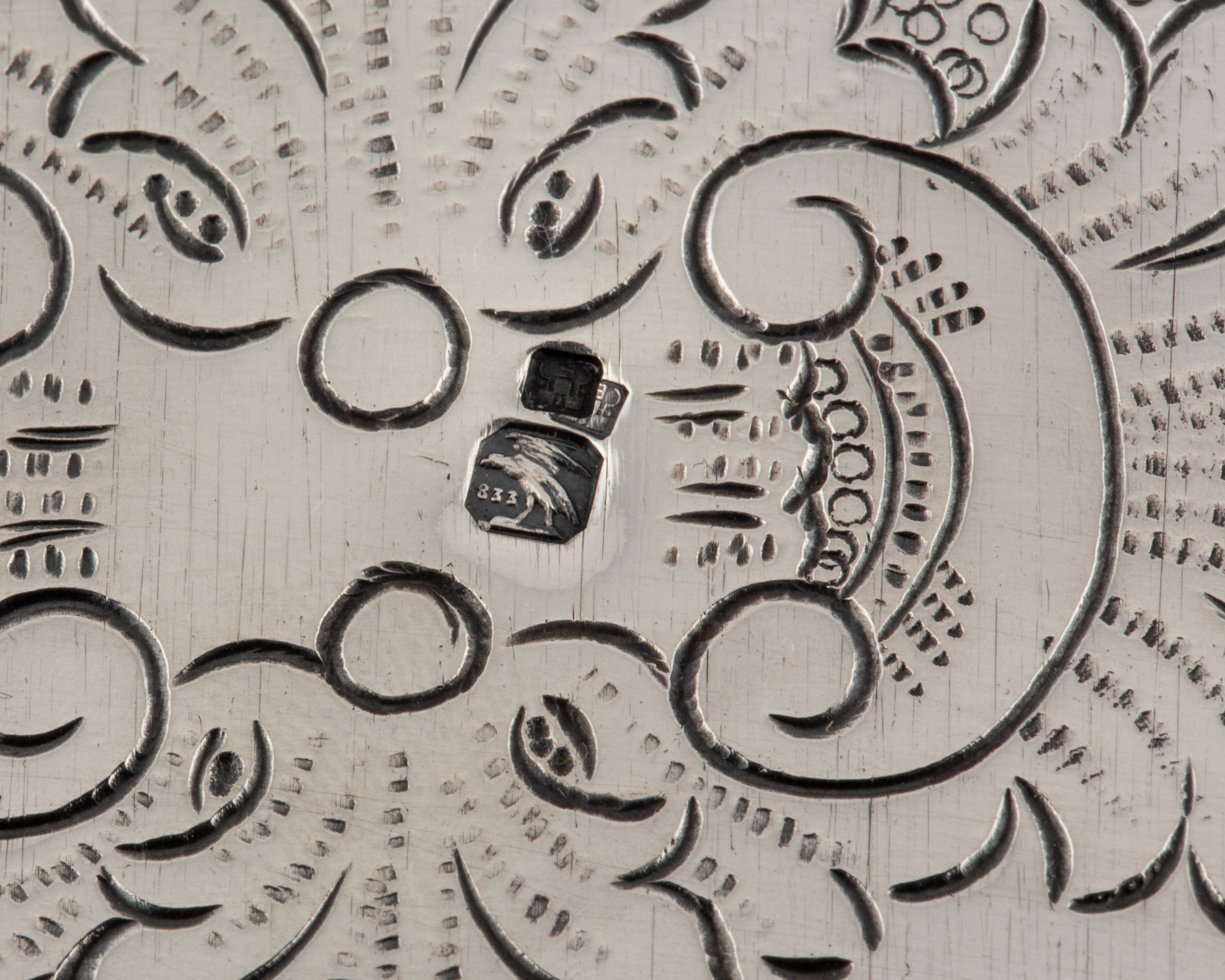 in argento 833il vassoio di forma circolare, profilo mistilineo, finemente sbalzato e cesellato con motivi fogliacei e conchiglie e inciso con motivi fogliacei; i due piatti bordo a volute con decori sbalzati a rilievo con conchiglie.
