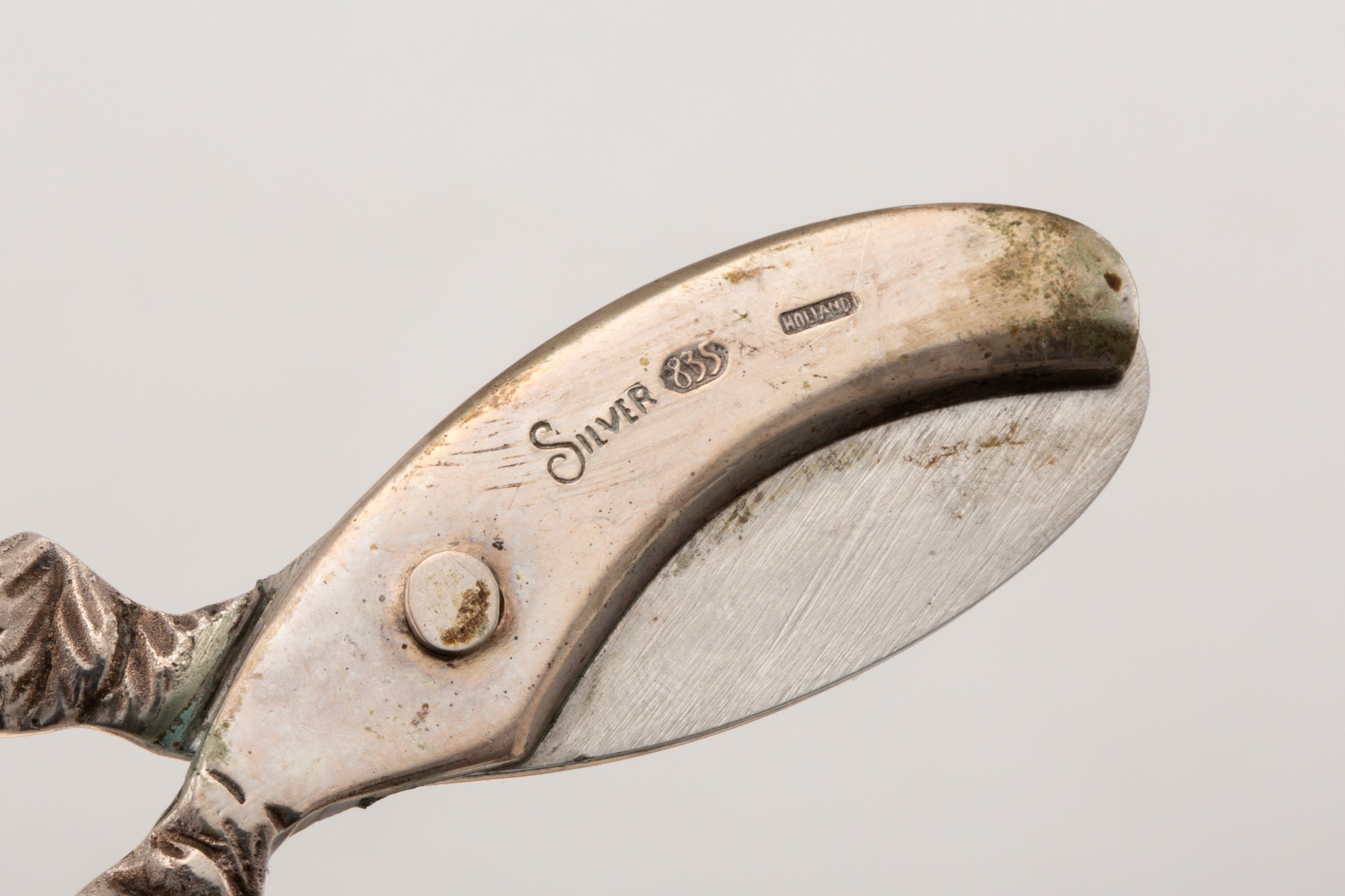 in argentocomposto da due sale e pepe, un cestino e una forbice; la forbice da uva con il corpo cesellato e la punzonatura Holland silver 835 (l cm 10,50);