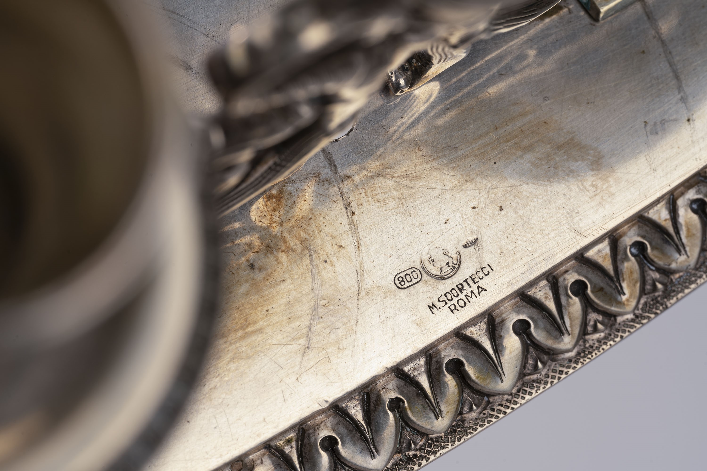 in argentoa quattro fiamme, base ovale, corpo decorato con motivili floreali, bracci a volute, centrato da vaso sorretto da cigni, le quattro bobeches con bordo a palmette, rivenditore M. Scortecci Roma.