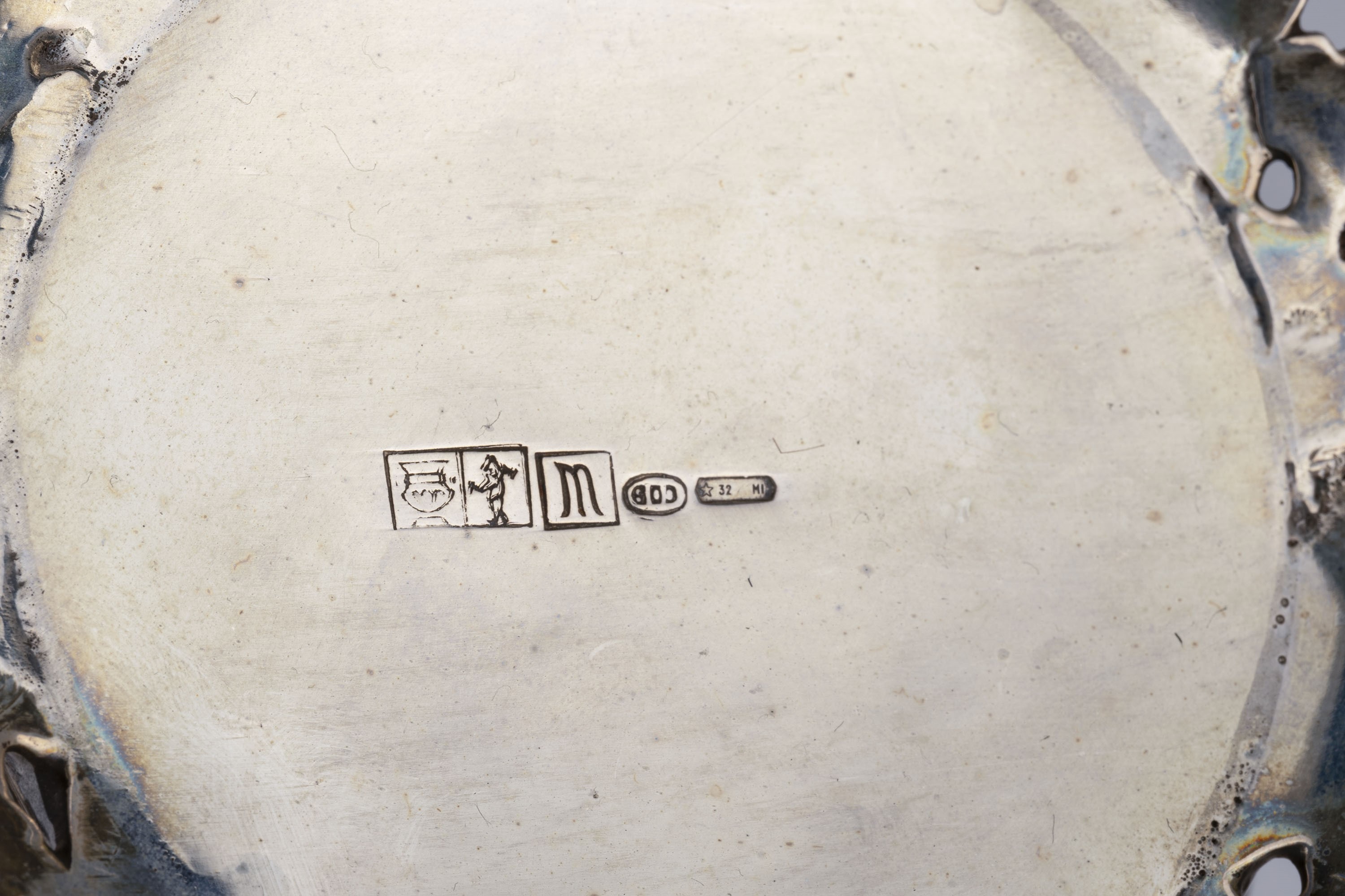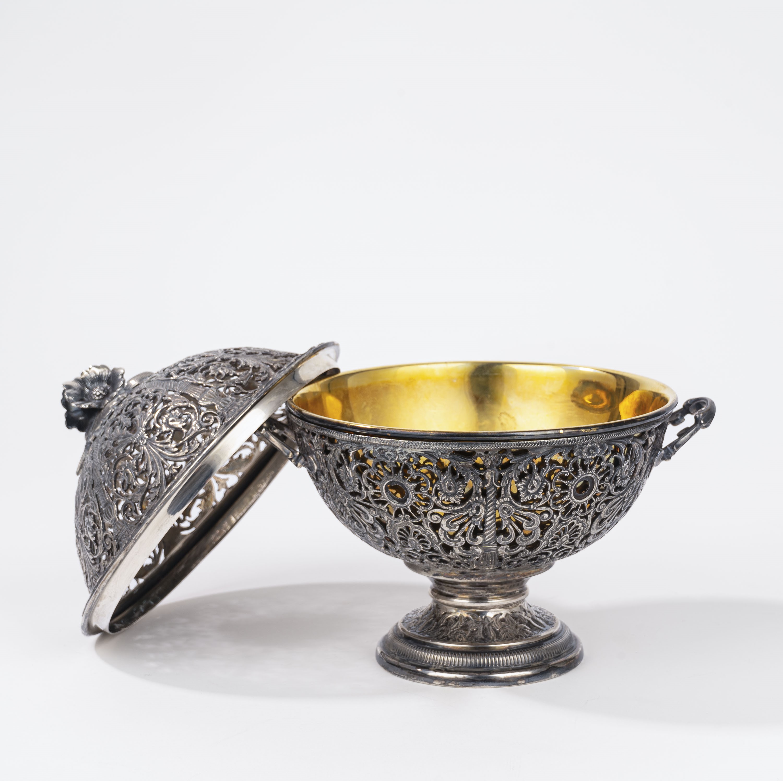 in argentocorpo a due sezioni finemente traforate a motivi floreali e architettonici, biansato, con presa del coperchio a fiore, coppa interna in vermeil.