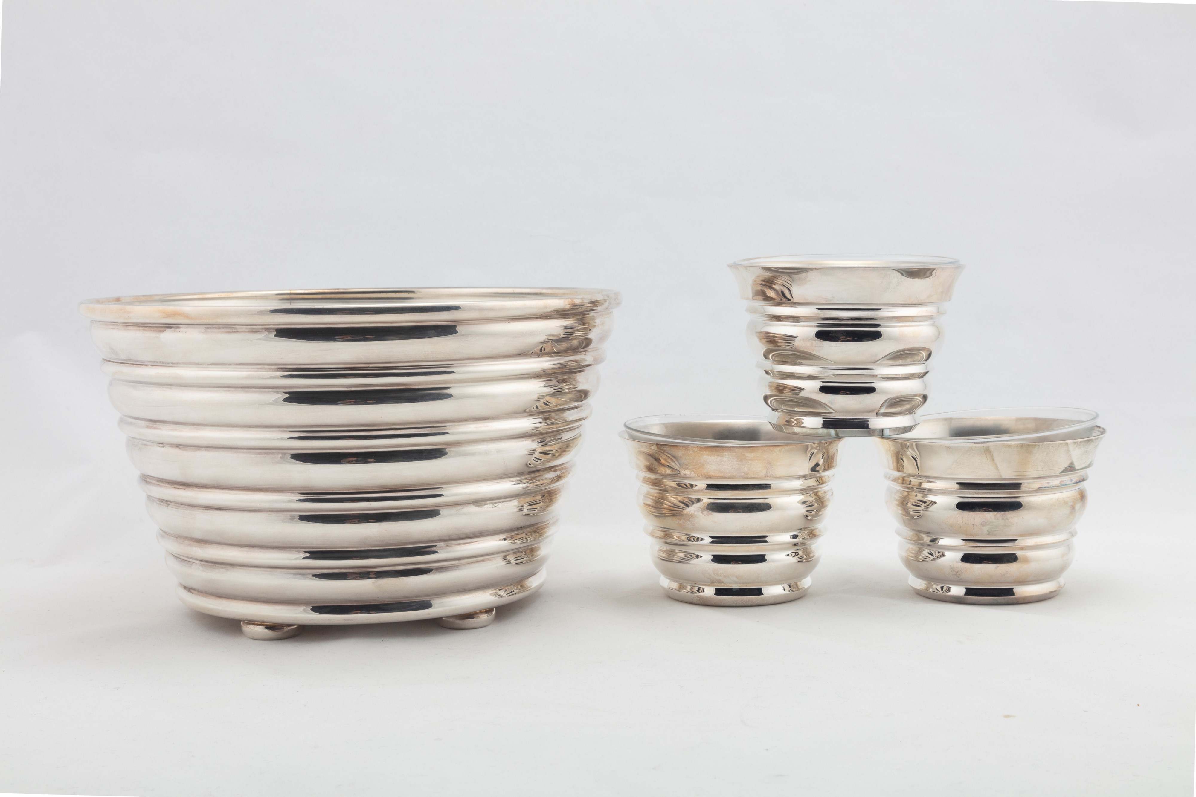 composto grande coppa con piedini a sfera (h cm 17,00 x d cm 27,00), tre coppe più piccole (h cm 8,50 x d cm 12,50), con interno in vetro, (lievi difetti).