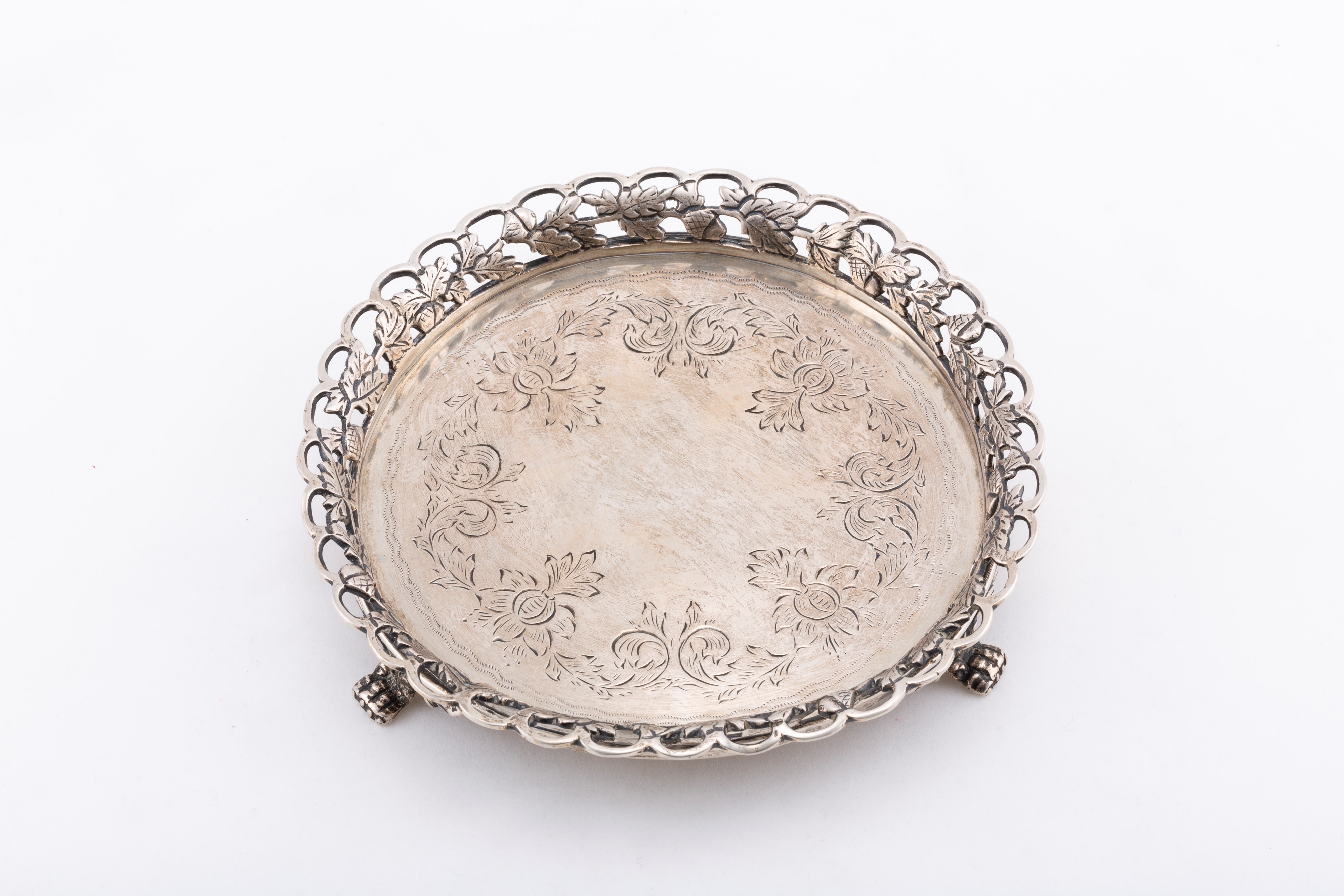 di forma circolare, bordo reticolato, sbalzato con foglie e ghiande, inciso con motivi floreali, poggiante su tre piedini zoomorfi.