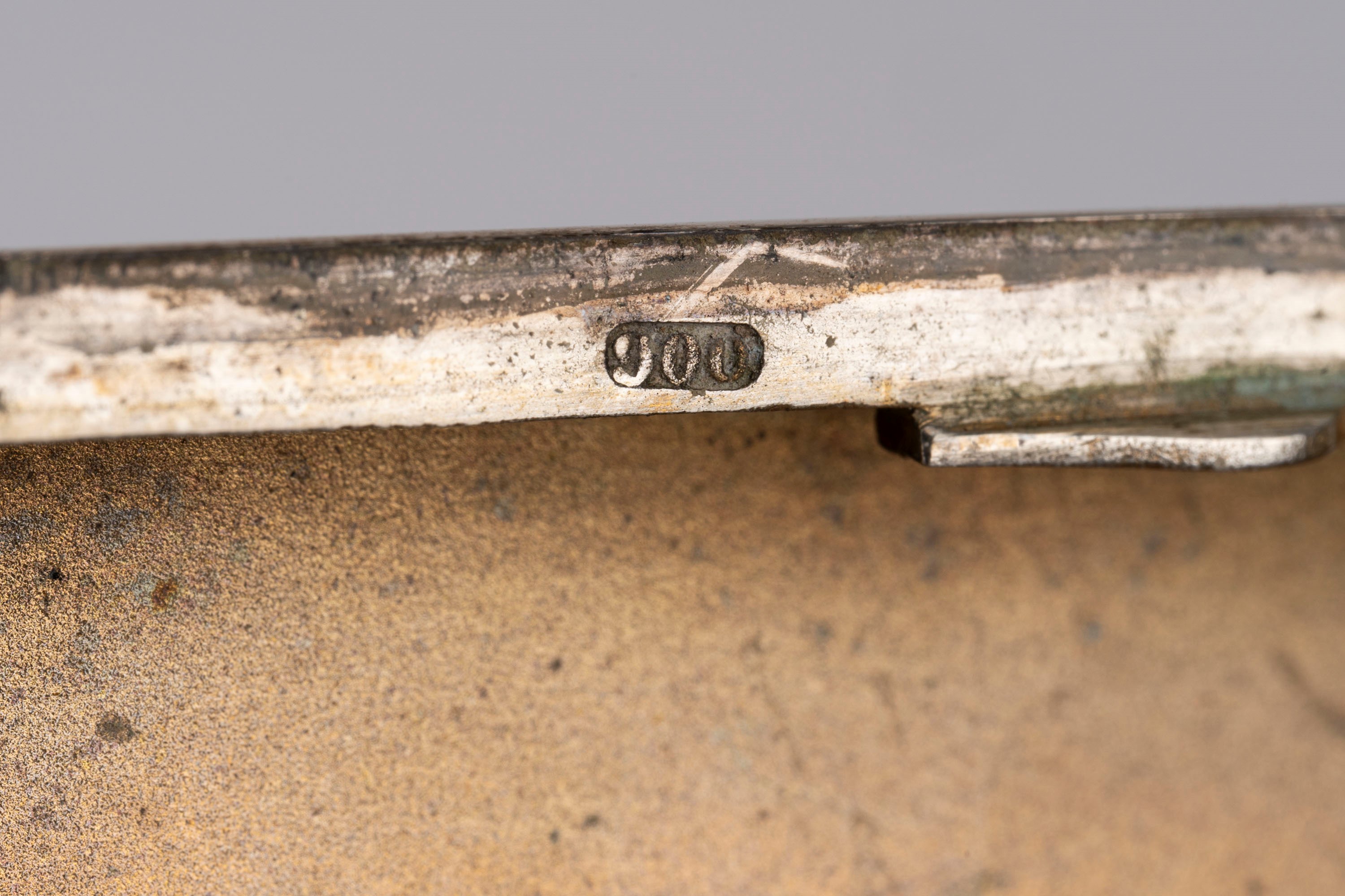 in argentosul fronte figura di cane da caccia in smalto, difetti.