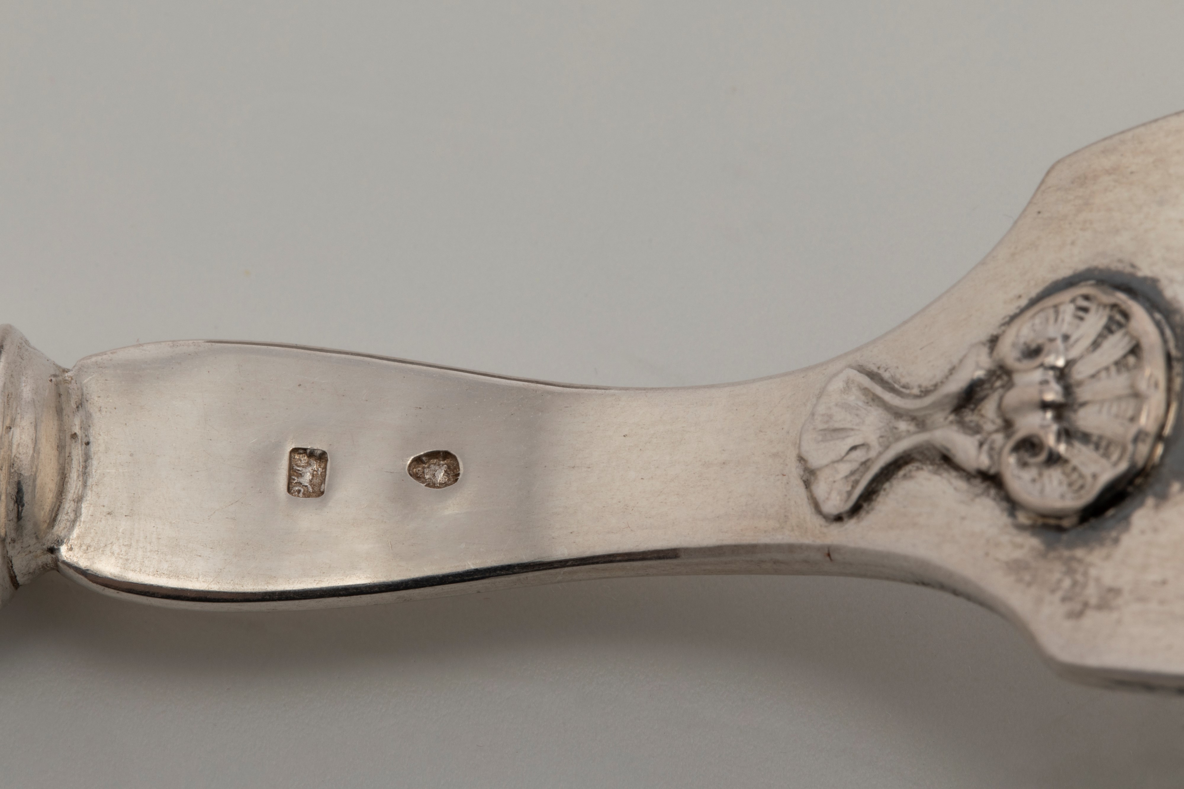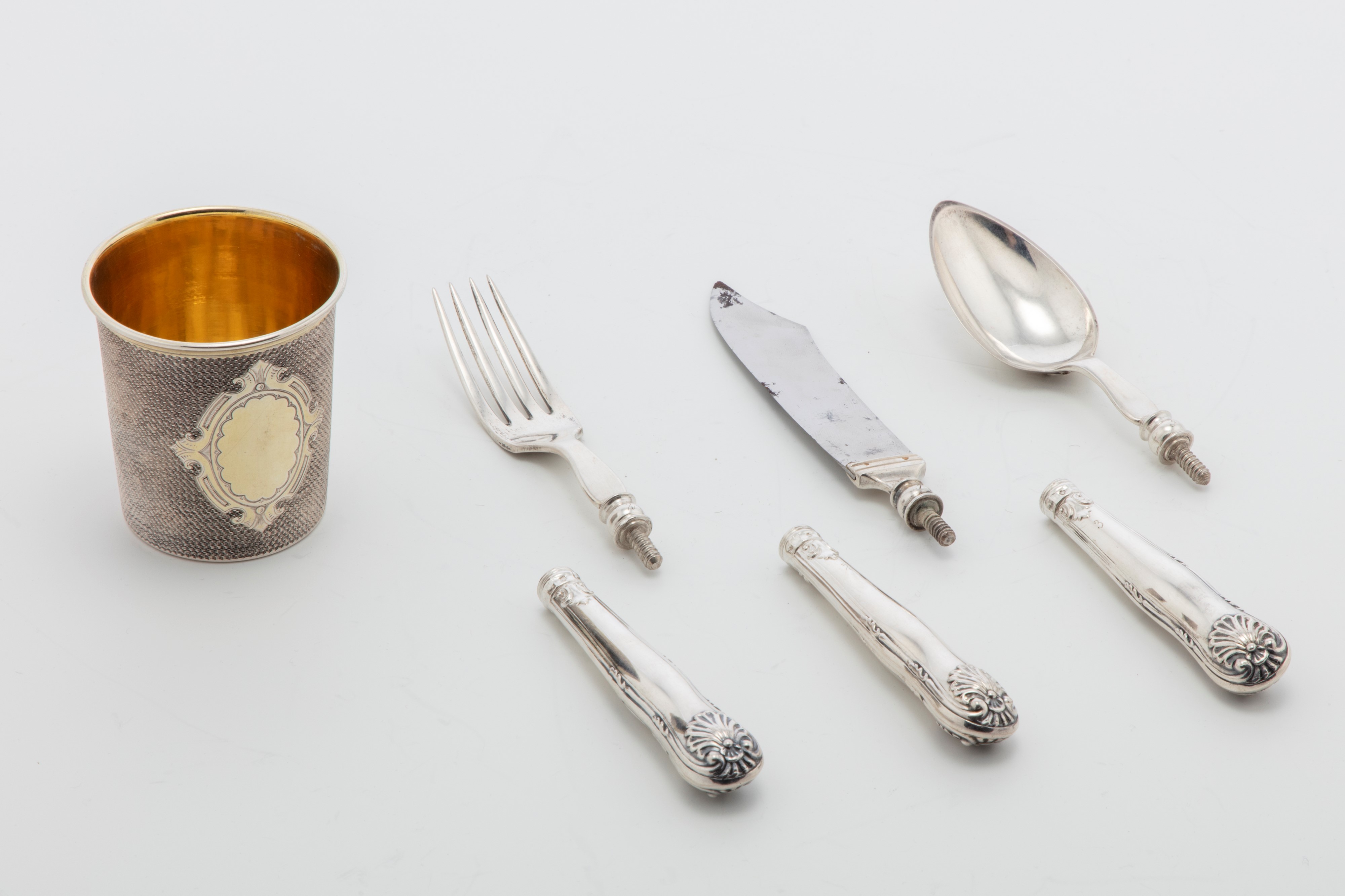 in argentoset di posate singolo da viaggio composto da un bicchiere a decoro martellato con stemma inciso e interno in vermeil, una forchetta, un coltello e un cucchiaio, (entro astuccio).