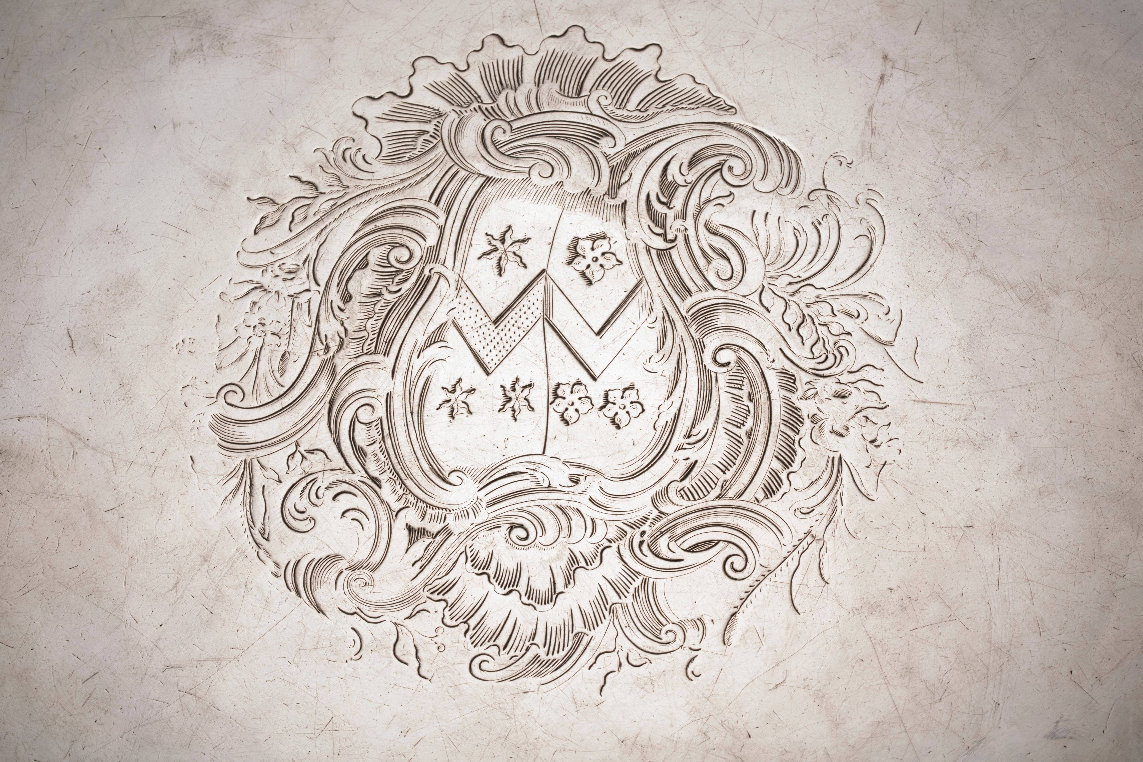 centrato da stemma araldico inciso, bordo mistilineo intervallato da conchiglie, sorretto da quattro piedini a ricciolo.