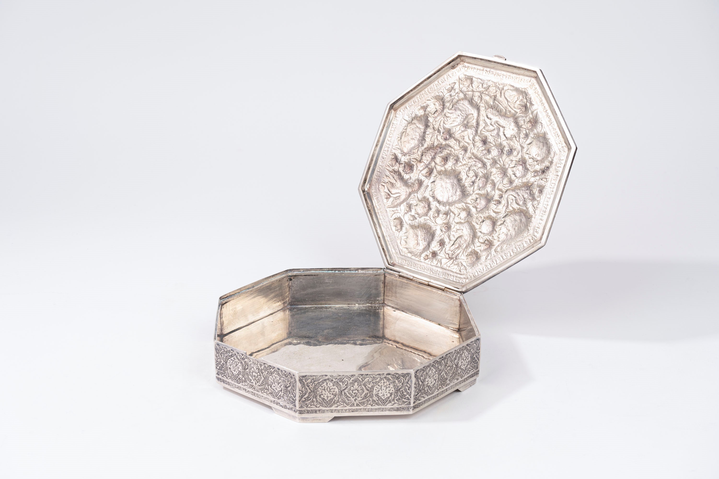 in argentodi forma ottagonale, decorata sul coperchio a motivi orientali e zoomorfi.