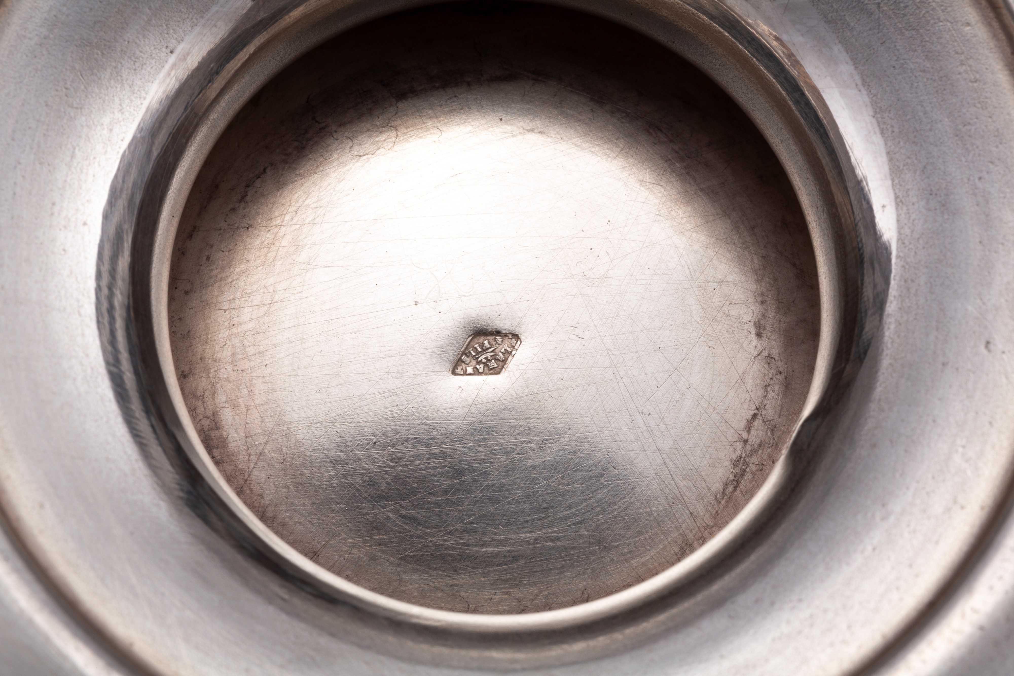 in argento 950base circolare, corpo con fascia incisa con decoro a grottesche, collo con monogramma inciso entro riserva, beccuccio sbalzato con motivi floreali, presa del coperchio a fiore.