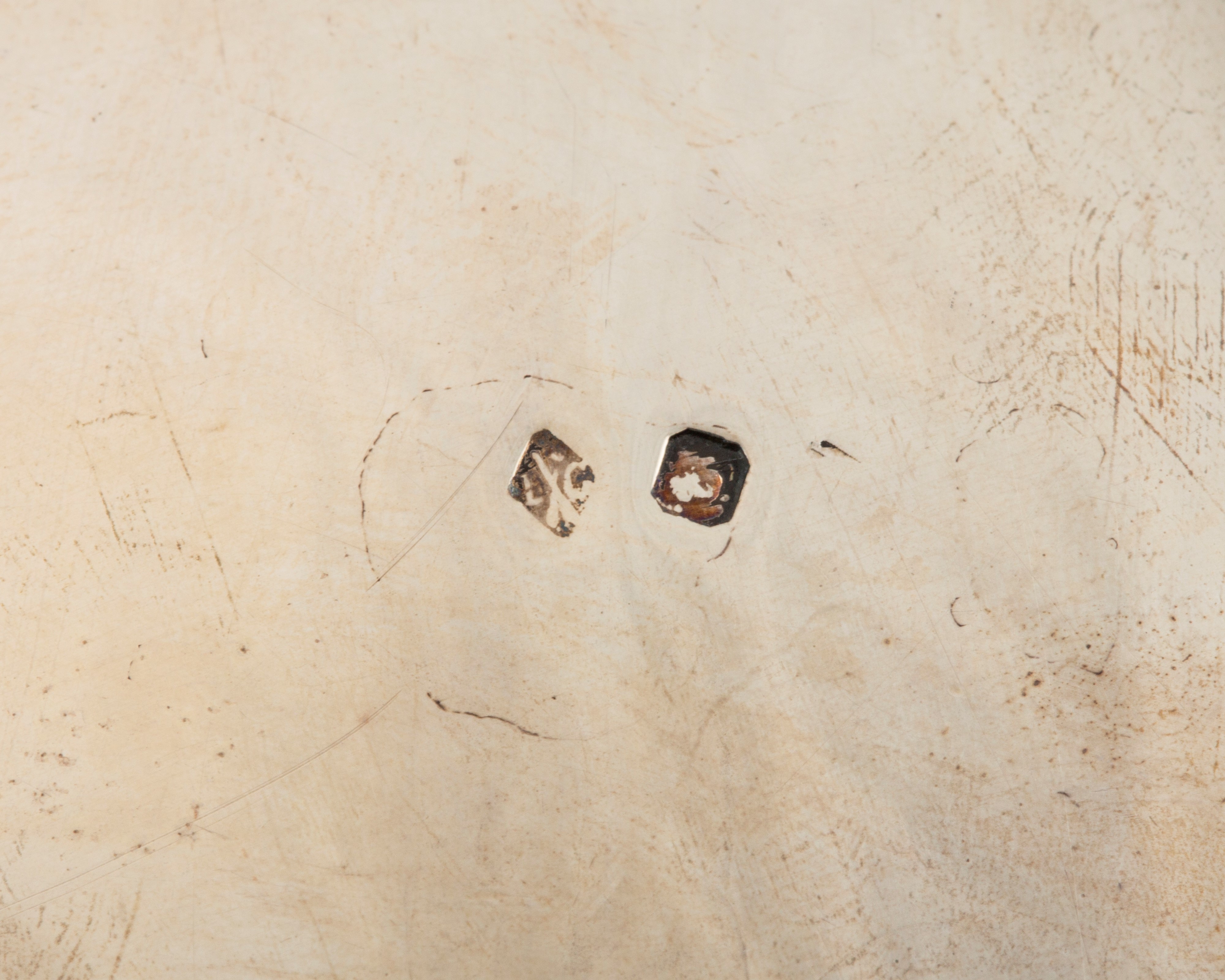 poggiante su quattro piedini ferini, il corpo nervato finemente cesellato e sbalzato, centrato da riserva fogliacea con stemma araldico, coperchio con ampie nervature e presa del coperchio a fiore.