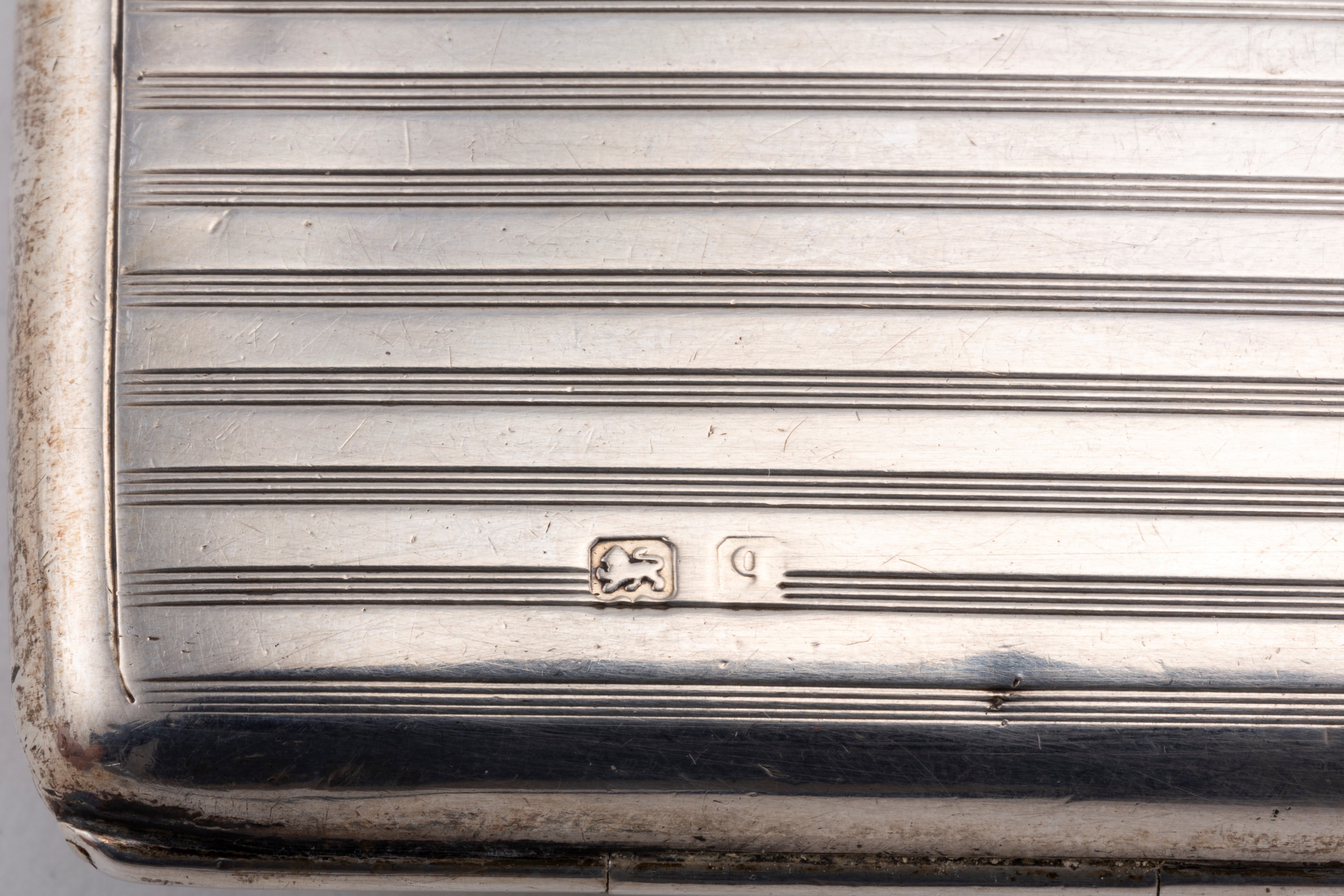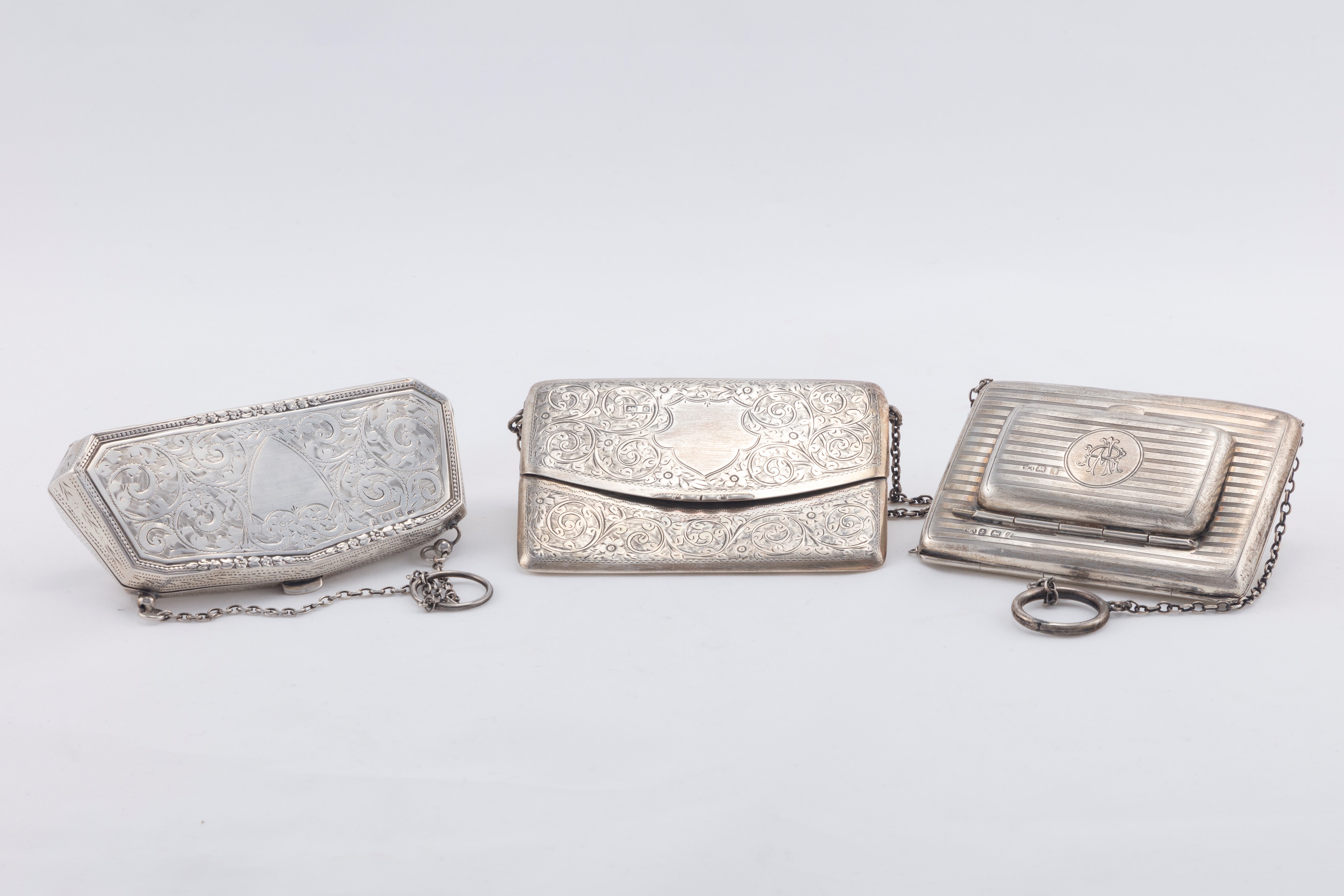 in argento 925uno di forma rettangolare finemente inciso con decori floreali e apertura frontale (l cm 10,00), uno zigrinato a due sezioni monogrammato AR (l cm 9,50), uno squadrato con il corpo inciso a decori fogliacei e il bordo perlinato e con decori floreali (l cm 12,50), difetti.