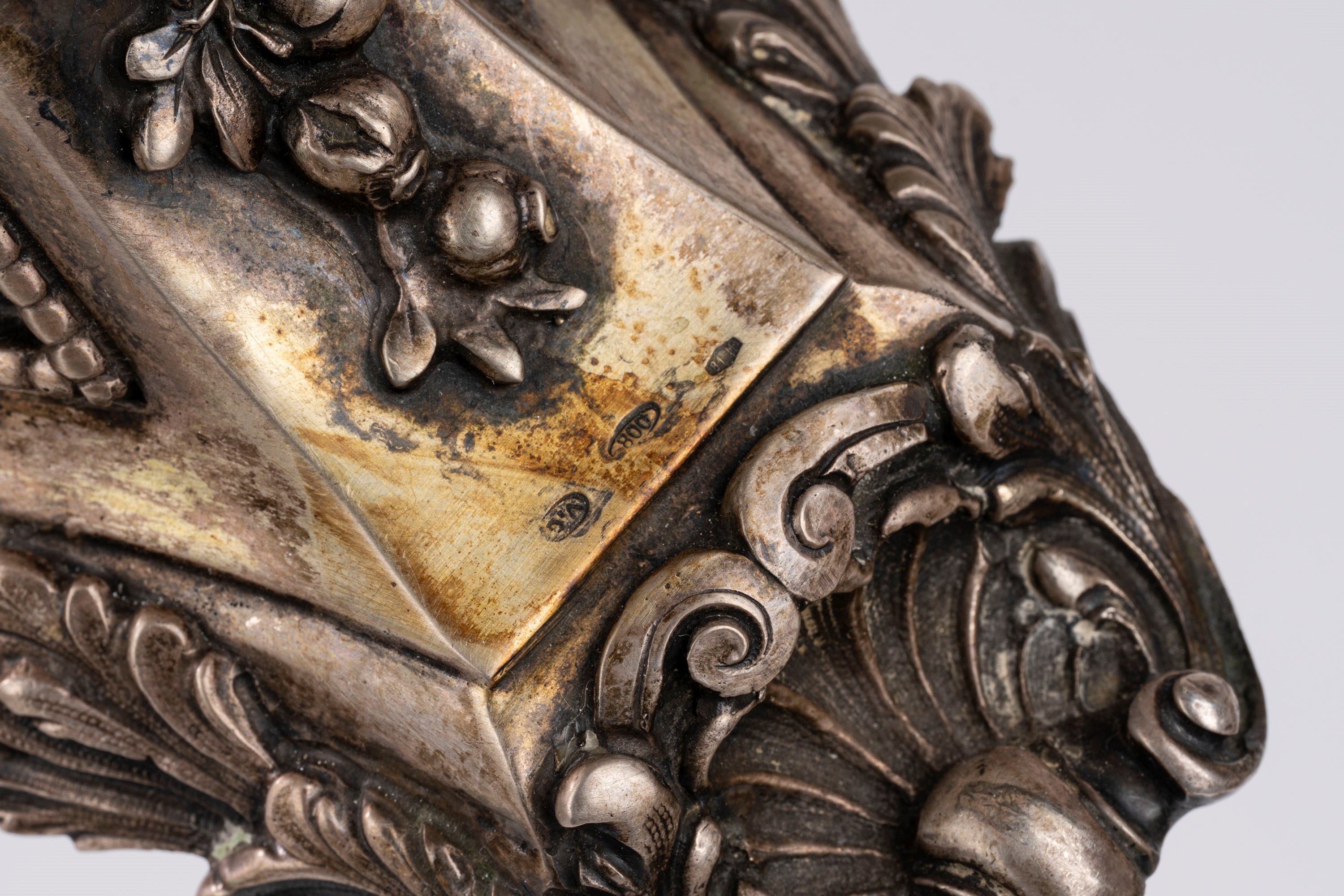 in argentoa sette fiamme, bracci mossi fogliacei, riccamente decorato e scolpito a decori fitomorfi, fusto con putto e viticci, base triangolare con mascherone, volute a conchiglie e foglie.
