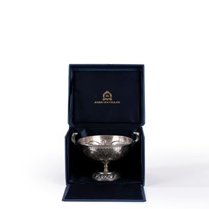 corpo interamente decorato a rami con fiori stilizzati, base circolare con decoro concatenato, anse curve laterali, firmata M. Buccellati, entro scatola originale.