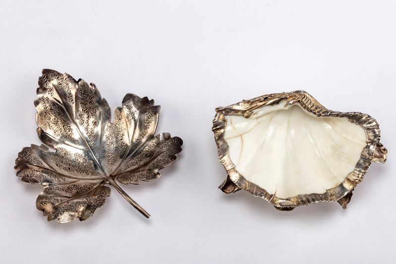 in argento 925foglia sbalzata e incisa a firma Mario Buccellati, conchiglia rivestita in argento, non firmata.