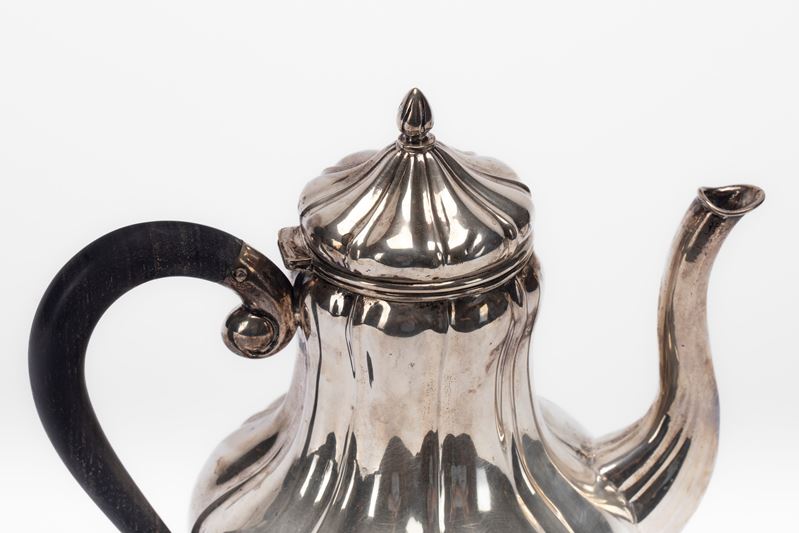 in argentocorpo piriforme sbalzato a grosse costolature, tre piedini mossi, beccuccio sagomato e presa in legno tornito.