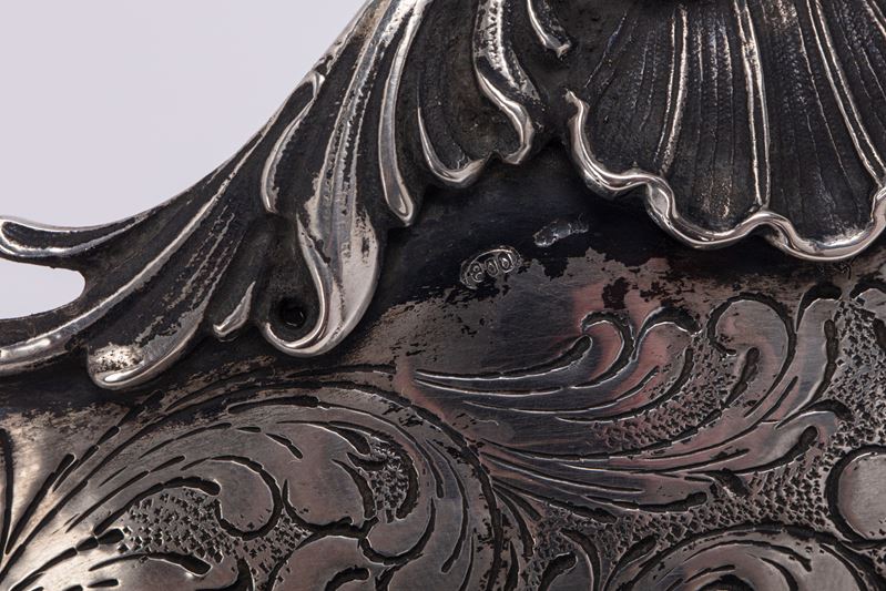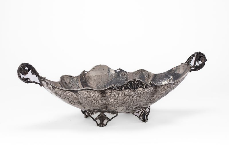 in argentodi forma allungata, con corpo decorato a leggera martellatura e fine incisione a volute, piedi, anse e bordo cesellati a foglie d'acanto e conchiglie stilizzate.
