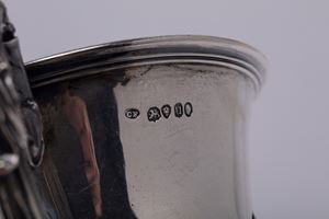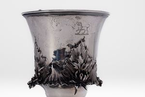 in argentocon presa sagomata e decorata, parte superiore liscia terminante con cesellatura a foglie e fiori sorretta da base tornita con piede ulteriormente cesellato.