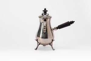corpo piriforme liscio sorretto da tre gambe sagomate, presa laterale in legno sfaccettato.