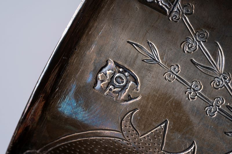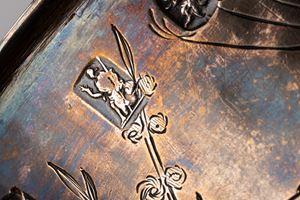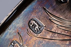 a due anse laterali mosse, corpo inciso a uccelli in un paesaggio.