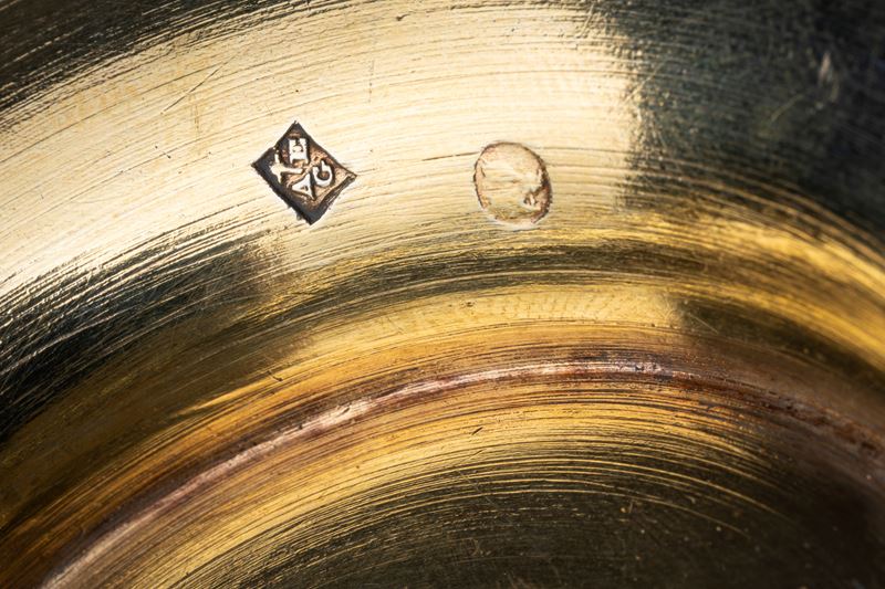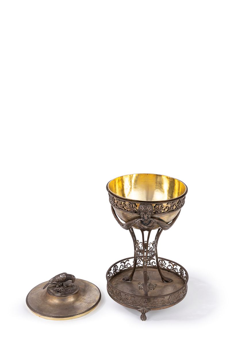 in argentoparte superiore con coppa semisferica con interno in vermeil e coperchio ornato da una scultura di pappagallo posata su un ramo, realizzata a tutto tondo, parte inferiore a base tripode ornata da mascheroni cesellati poggiante su ulteriore base tonda con ringhierina traforata, punzoni di garanzia e punzone dell’argentiere non identificato AEG.