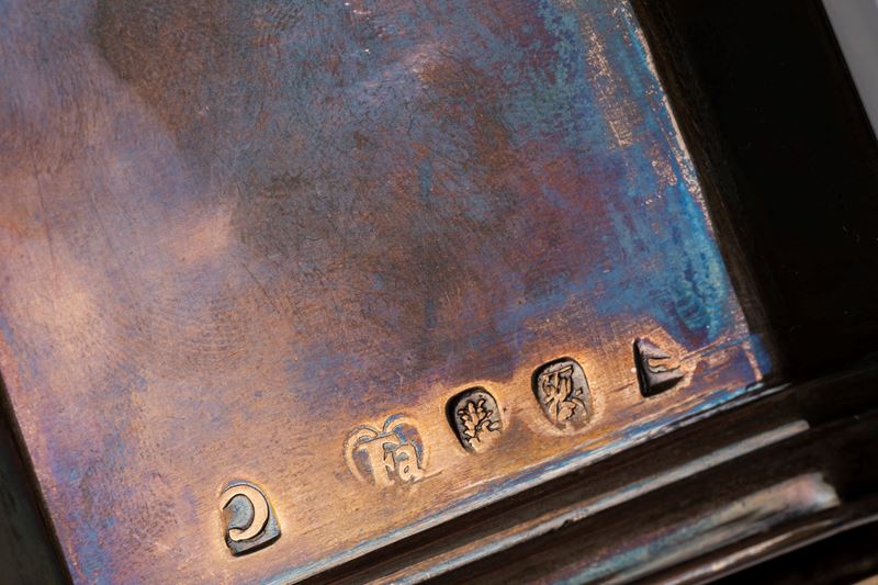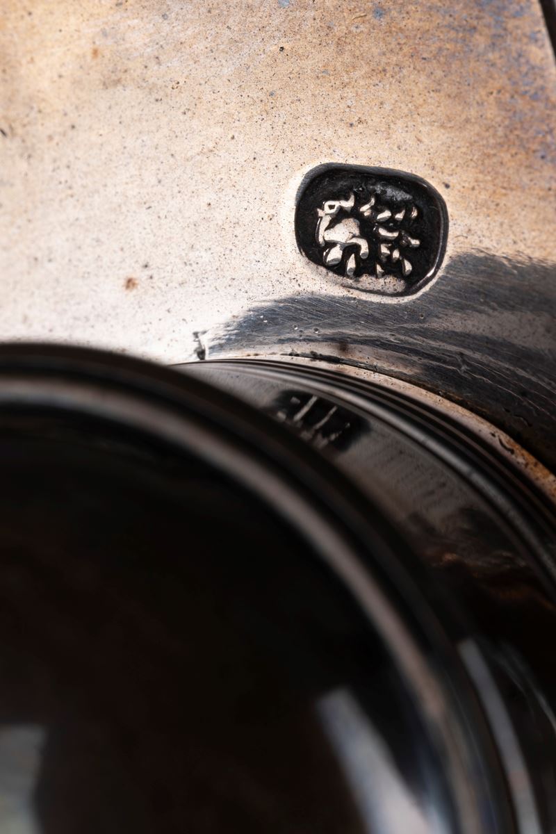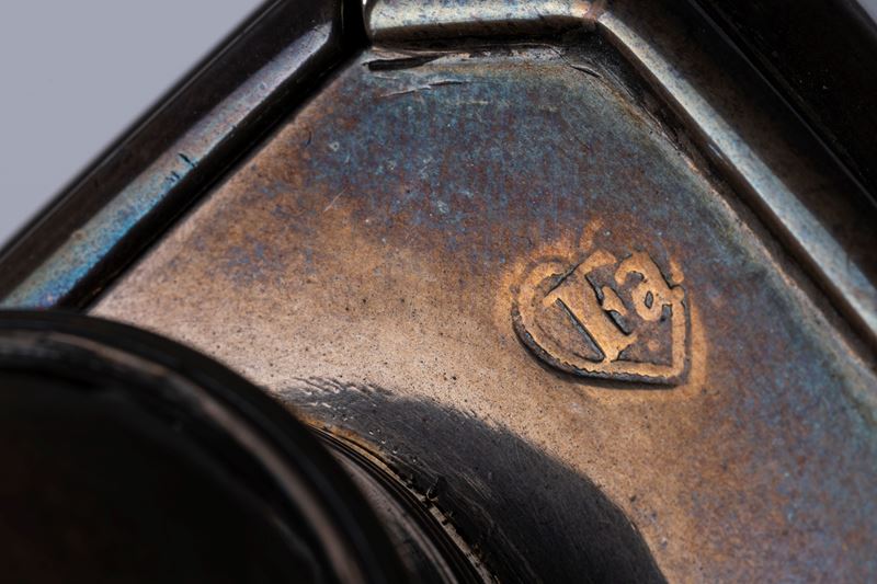 in argentocorpo di forma geometrica ottagonale con parte superiore apribile con coperchi torniti. (Lievi difetti).