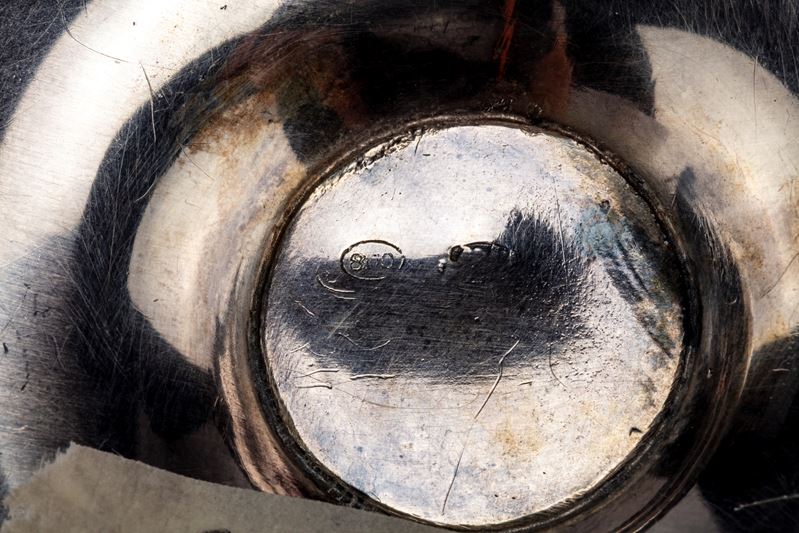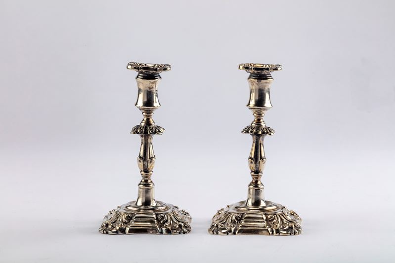 in argentocon fusto tornito e decorato a foglie e volute, su base squadrata e sagomata.