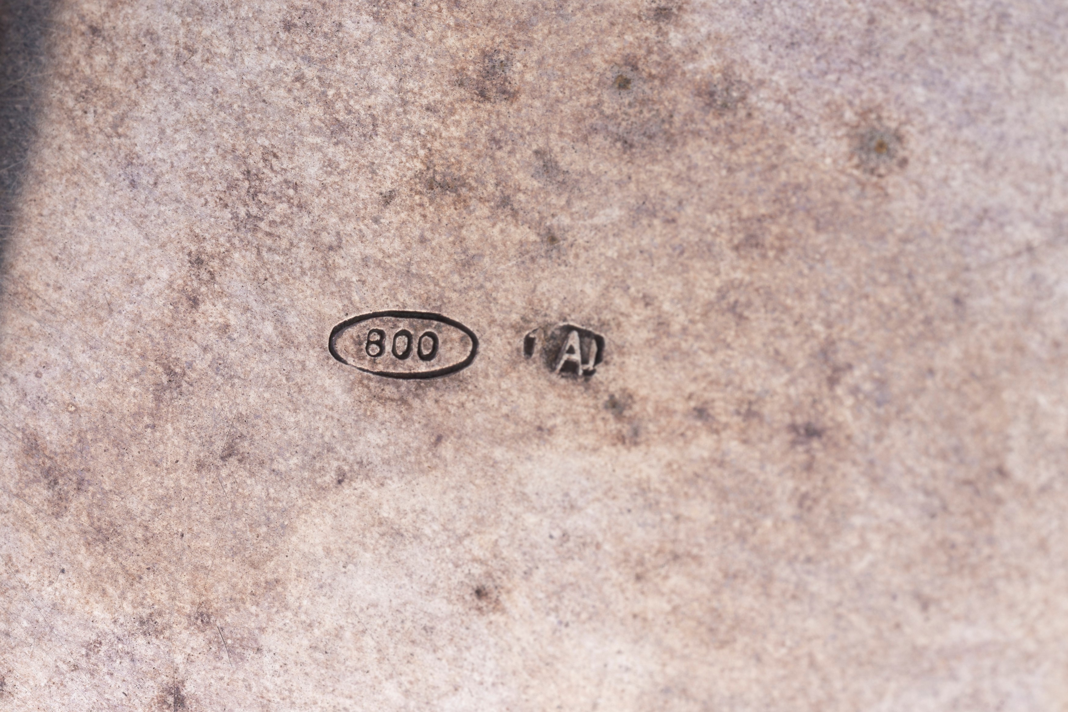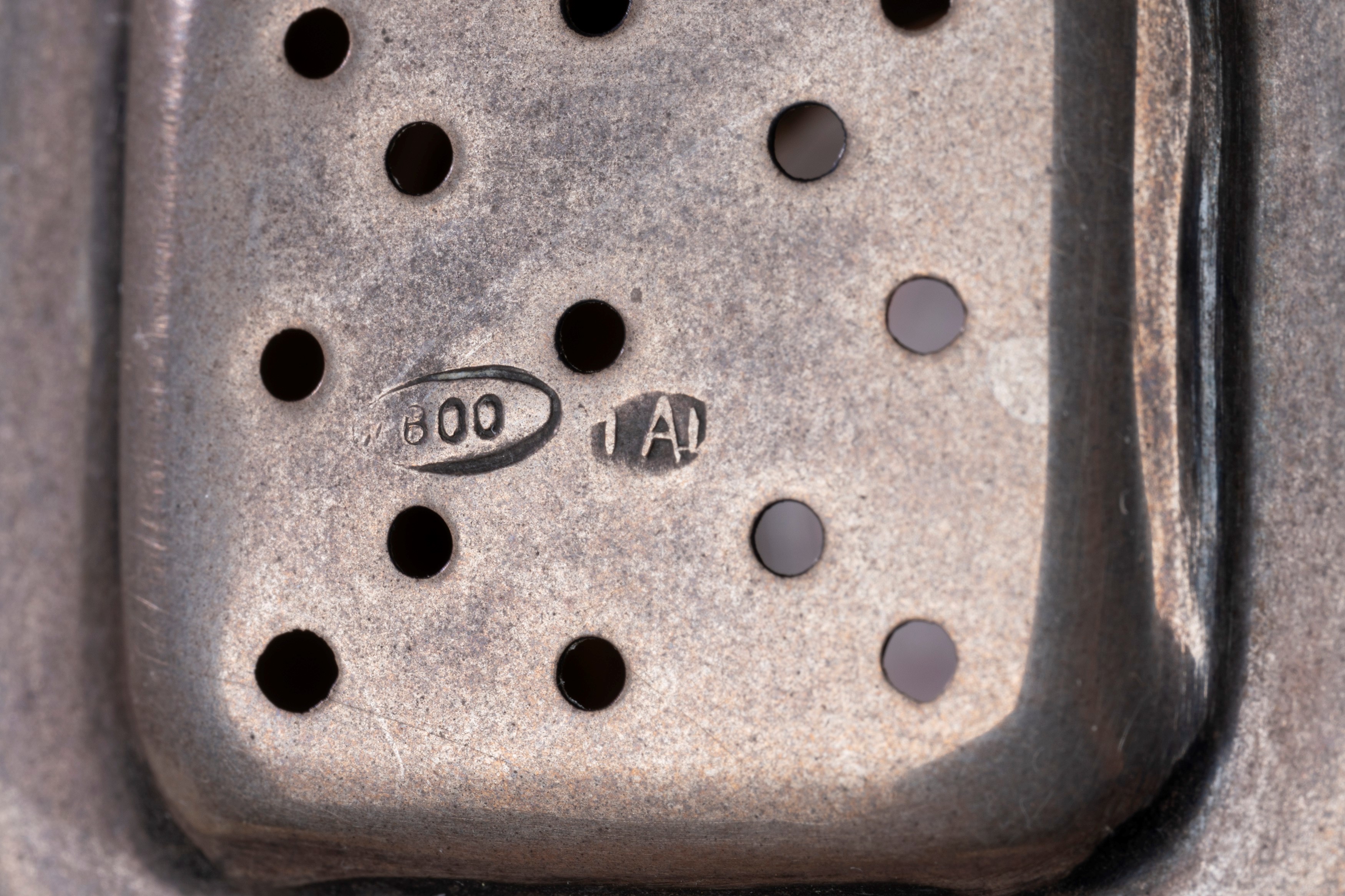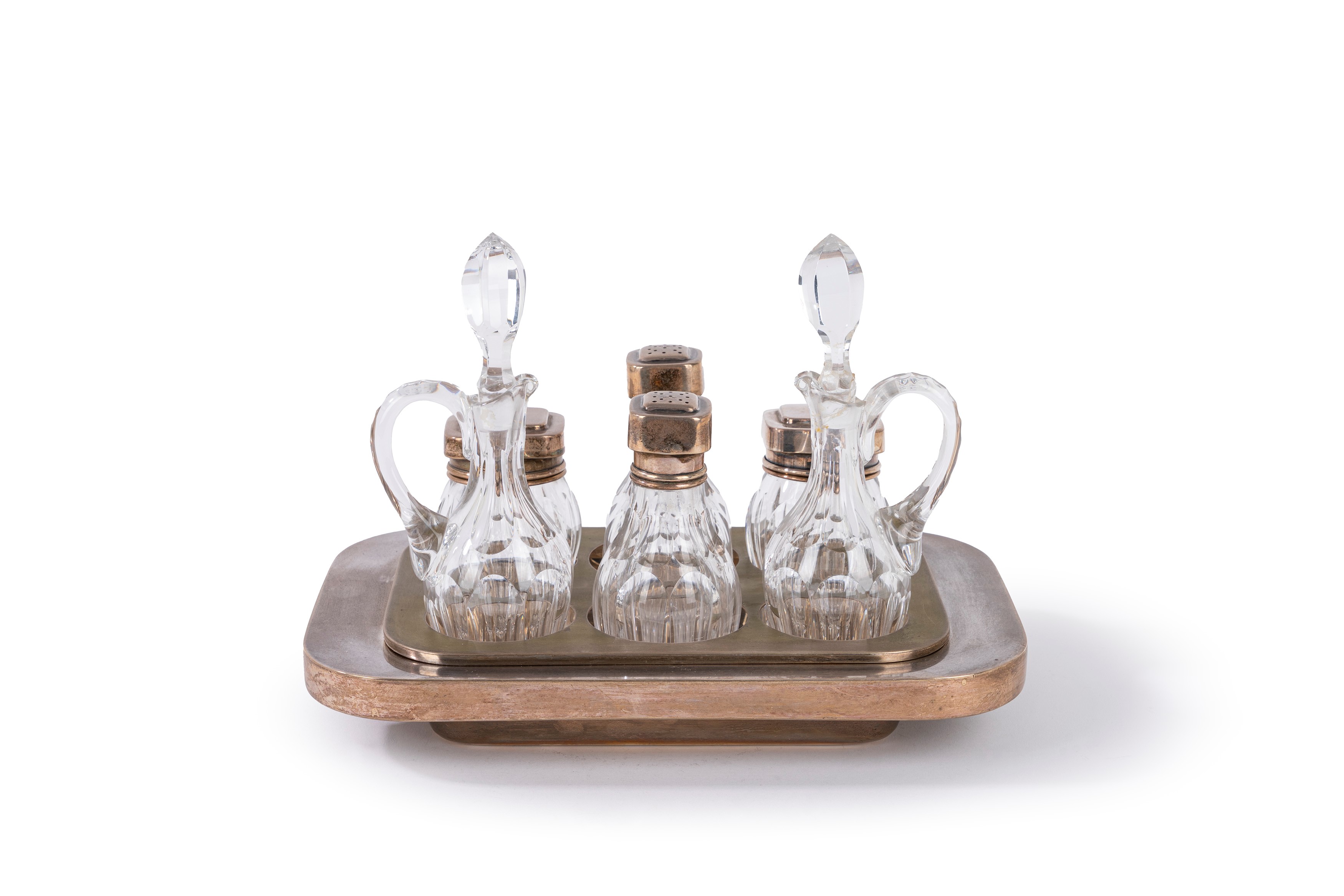 in argento e cristallocomposto da oliera, acetiera, saliera, pepiera e due porta spezie, con coperchi di forma geometrica liscia.