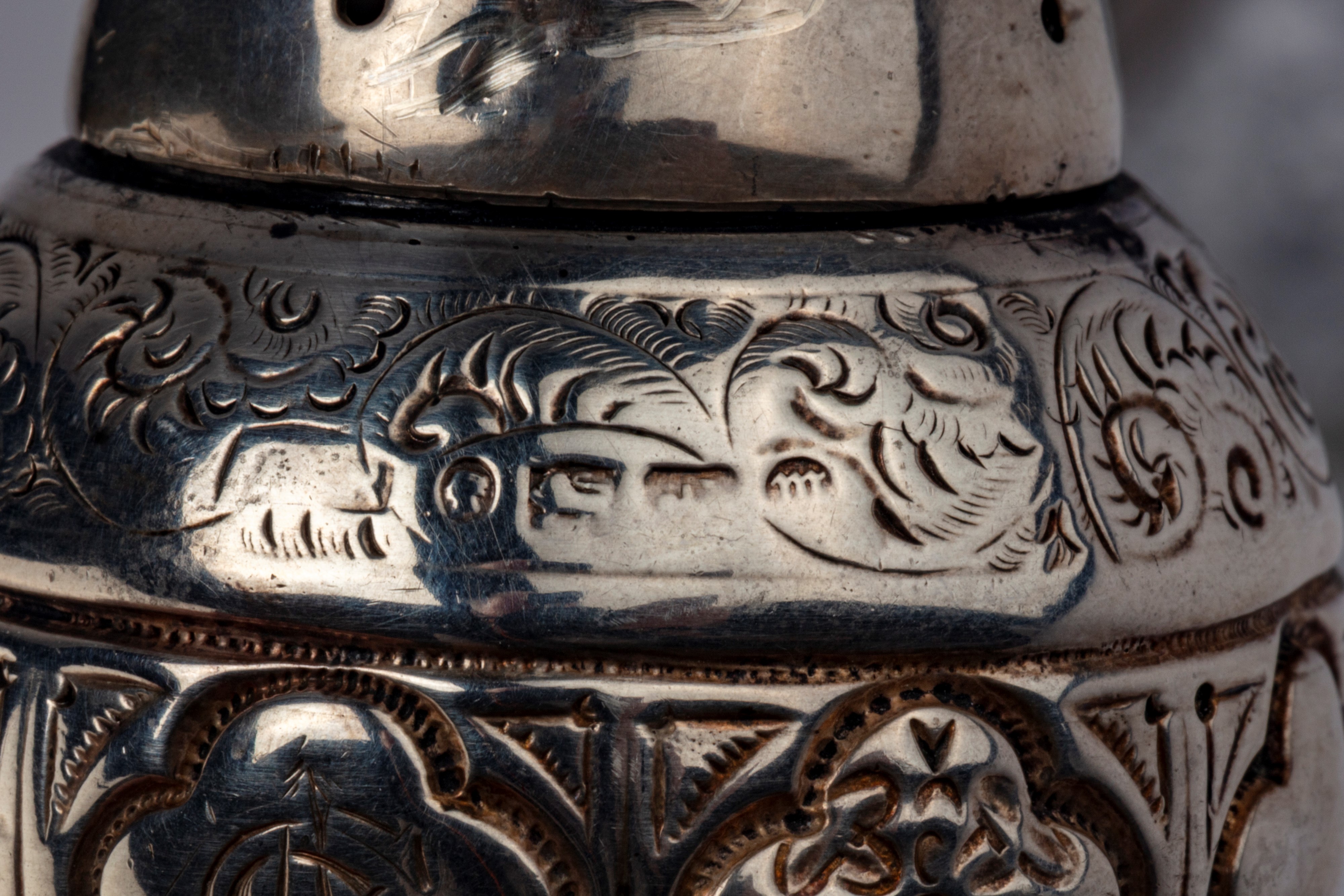 in argentodi diversa fattura e decoro, una coppia di forma piriforme con corpo inciso, una coppia in cristallo molato con spargisale in argento traforato.