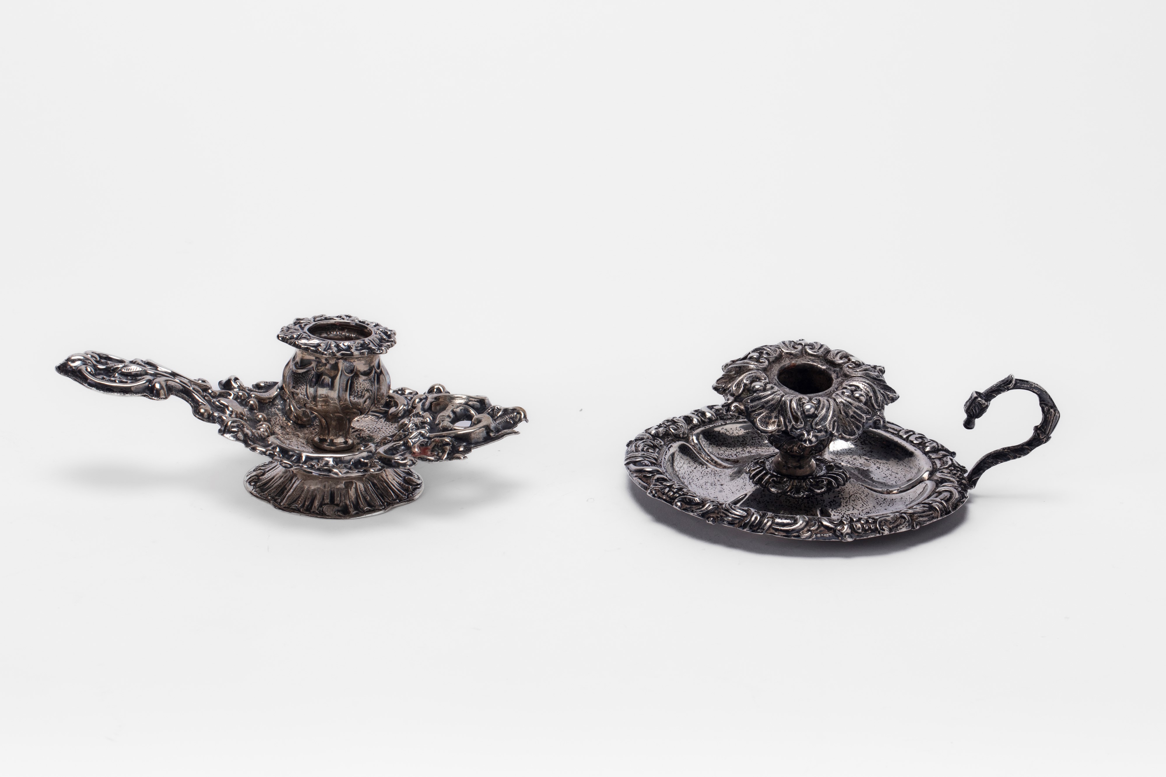 in argentodi epoche diverse, con piattini sbalzati a fiori e volute, reggi candele torniti e cesellati. (Lievi difetti).