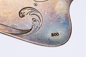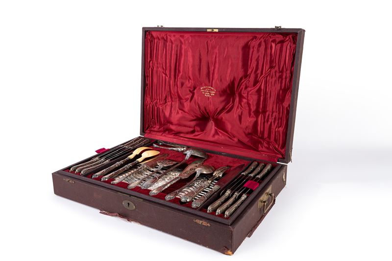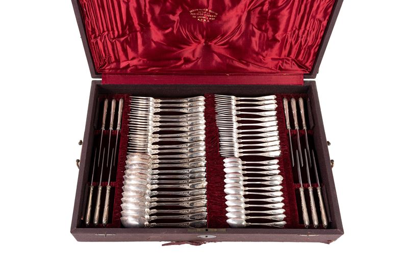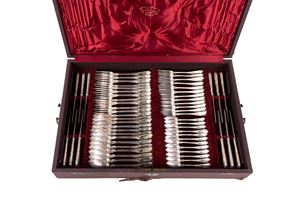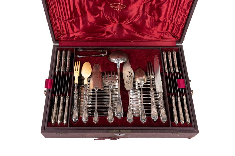 12 forchette, 12 coltelli, 12 cucchiai, 12 forchettine da frutta, 12 coltelli da frutta, 12 cucchiaini da dessert, 10 posate di servizio, entro scatola originale. Prese cesellate a volute decorate con monogramma inciso.