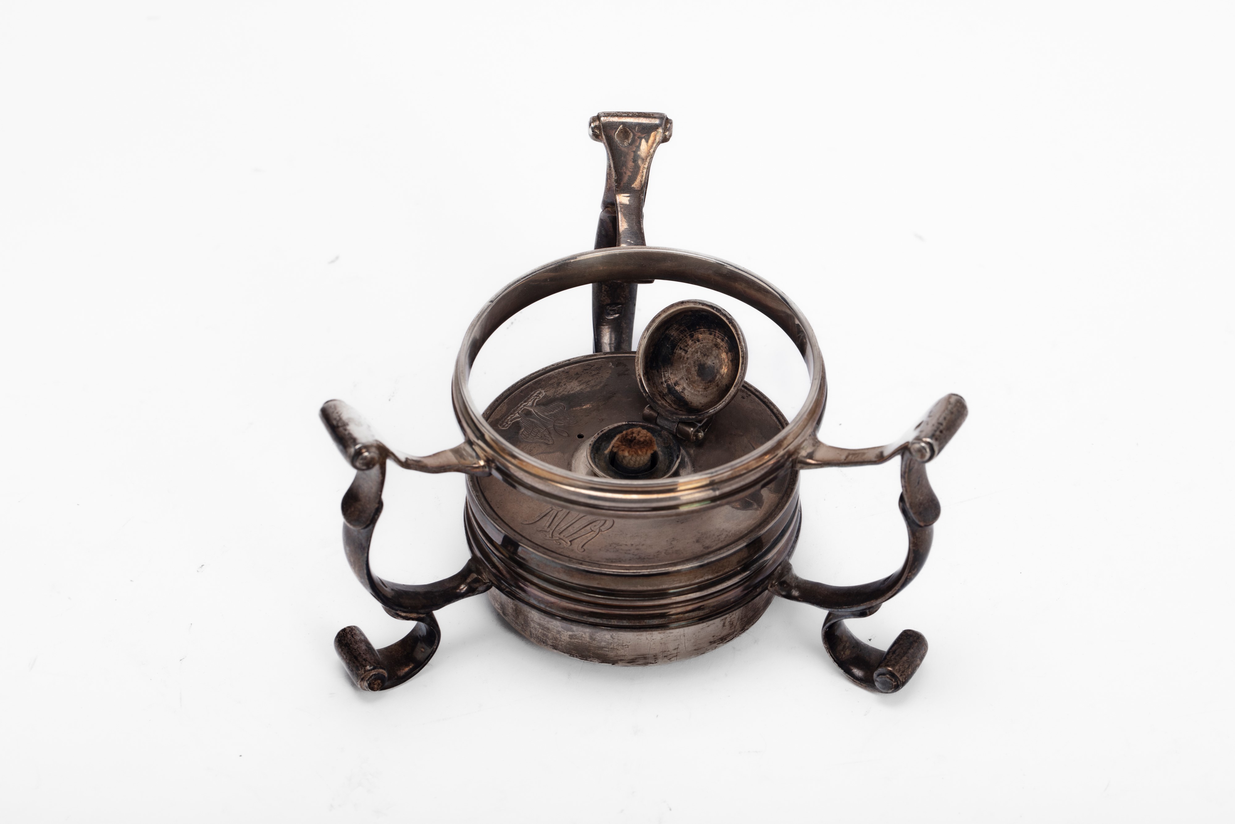 con struttura a tre gambe laterali mosse, al centro fornelletto tornito con incisione a stemma e monogramma.