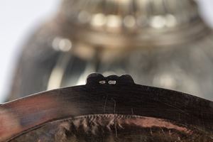 in argentoa parti alternate con decorazioni incise, bordo del piatto cesellato a volute, brocca con presa sagomata, decorazioni con pietre dure taglio cabochon applicate.