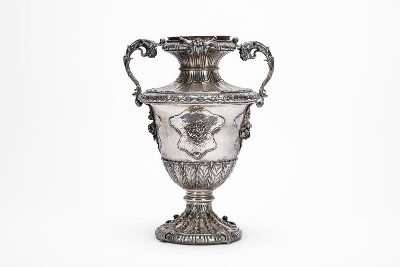 in argentodue anse cesellate a volute con uva stilizzata. Corpo sbalzato a foglie d'acanto e trionfo floreale al centro incorniciato da profilo sagomato. Base tornita con bordatura dentellata e applicazioni a foglie.
