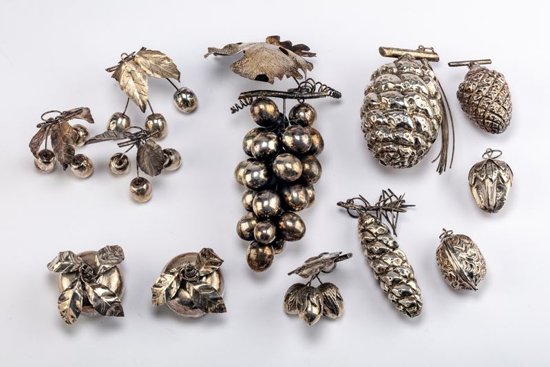 di diversa foggia e misura, tra i quali un grande grappolo d’uva, delle noci e delle ciliegie.
