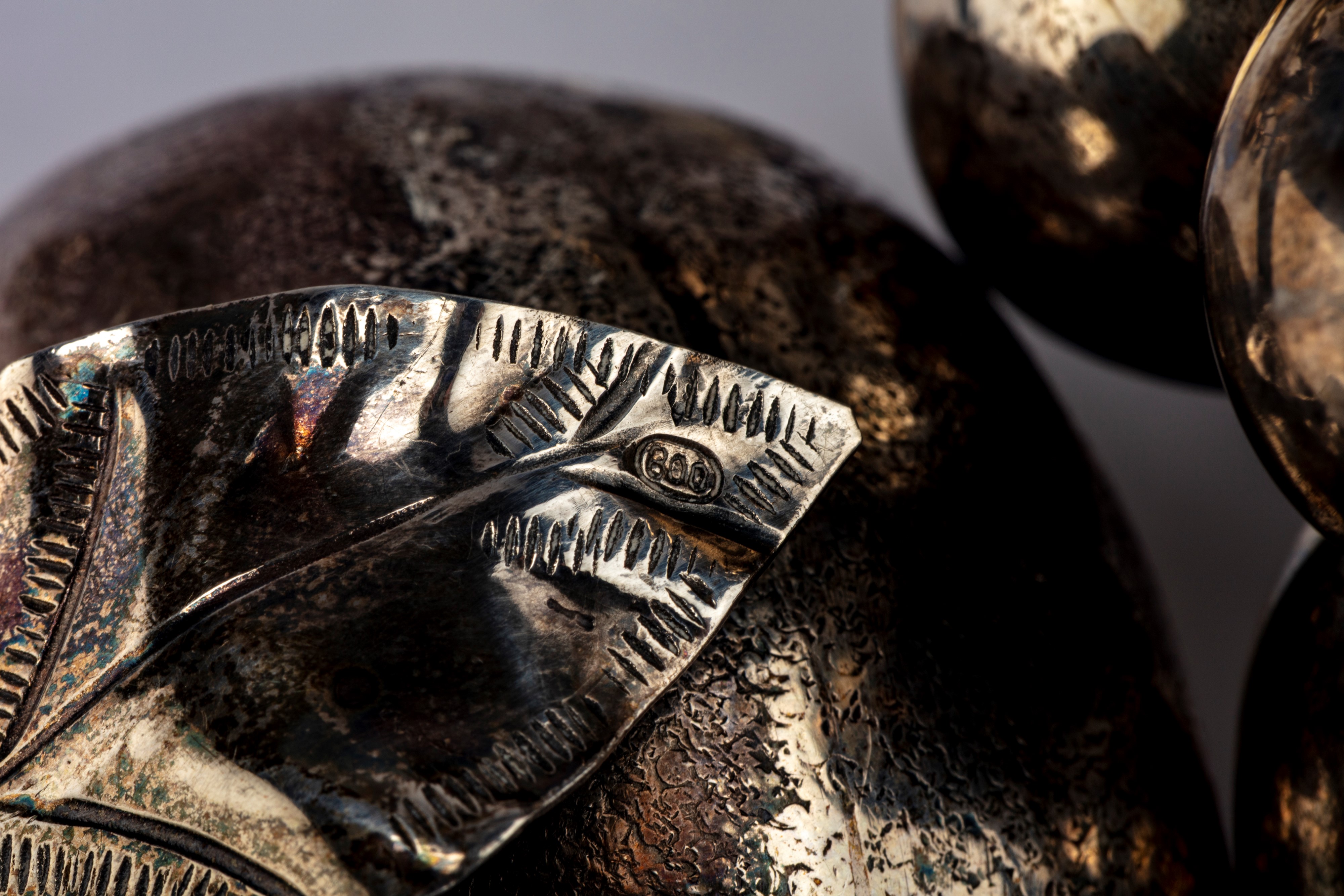 in argentodi diversa foggia e misura, tra i quali un grande grappolo d’uva, delle noci e delle ciliegie.