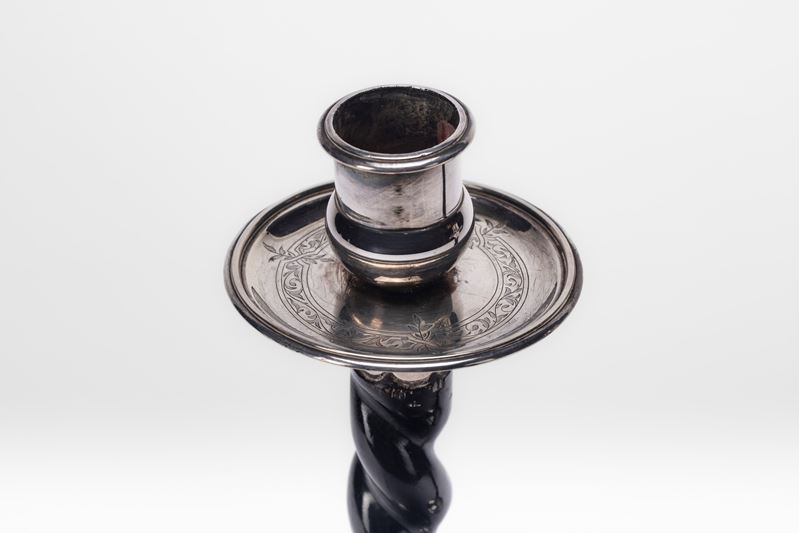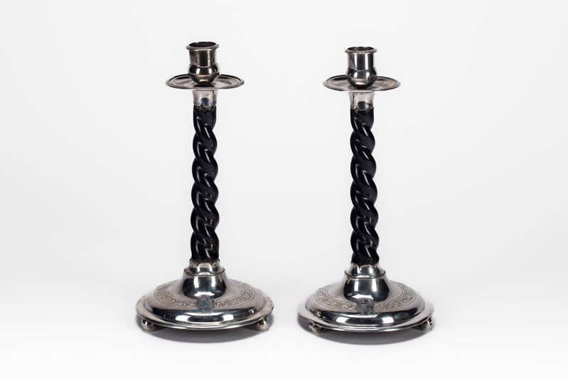 con fusto a torciglione, base tonda incisa a motivi concatenati sorretta da piedini sferici. (Difetti).