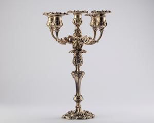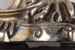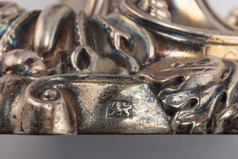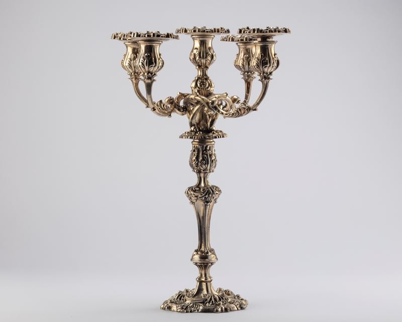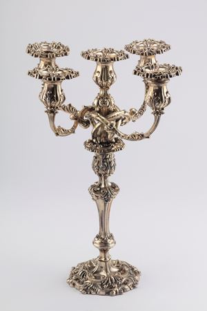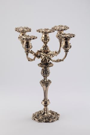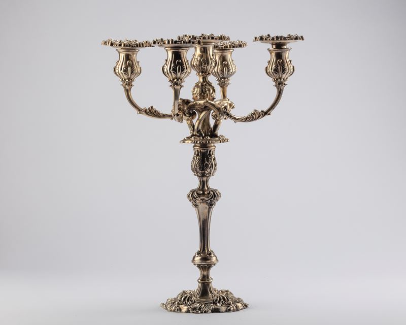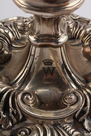 a cinque fiamme, di gusto Rococò con fusto e base cesellati a volute e foglie, parte superiore a quattro braccia mosse ed intrecciate nella parte centrale, base con decoro a foglie e volute, iniziale incisa "W" coronata.