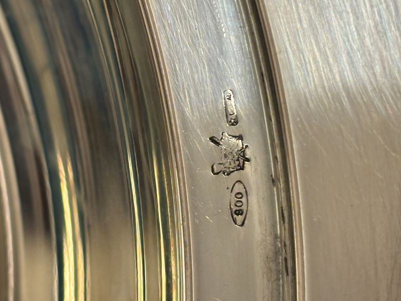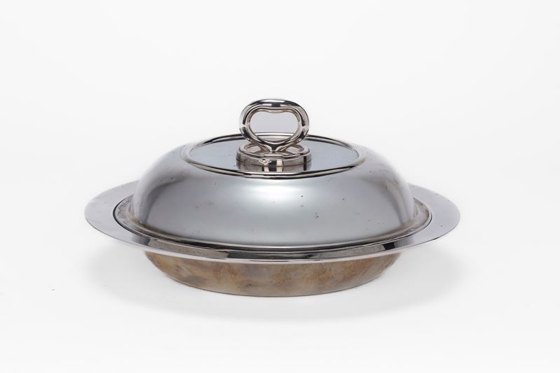 in argentodi forma tonda a corpo liscio, con coperchio con presa sagomata.