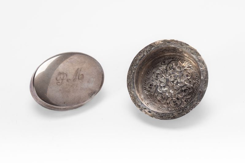 composto da una scatola porta pillole a corpo liscio e contenitore decorato con incisioni.