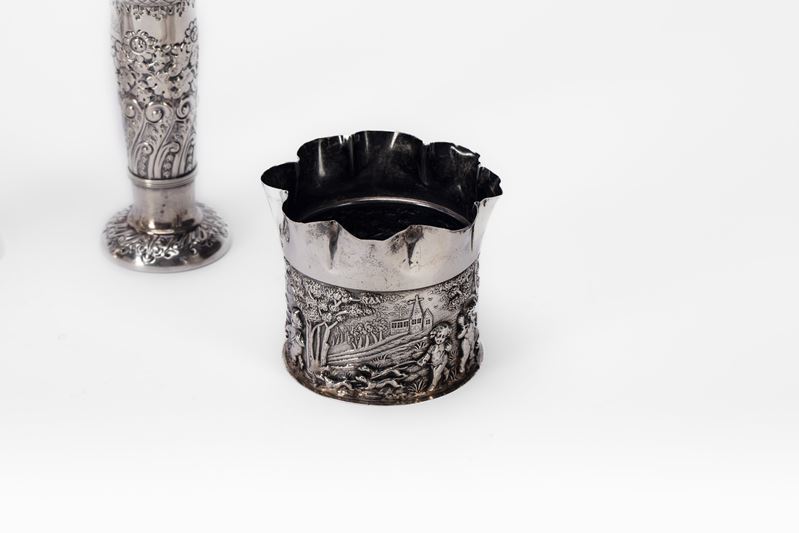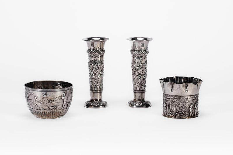 composto da due porta bon-bon a corpo sbalzato con scene di caccia e putti in un paesaggio e due vasetti a collo stretto sbalzati a fiori e volute.