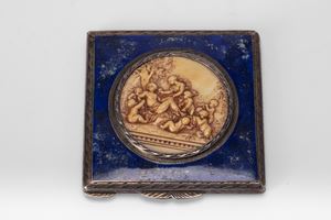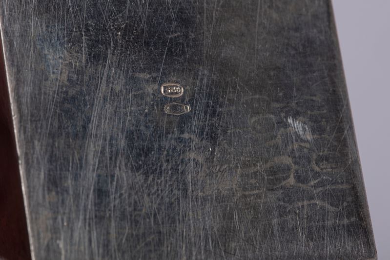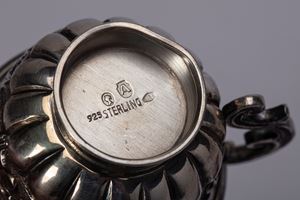 in argento 925composto da una piccola tazzina in argento 925 a corpo sbalzato, un posacenere in argento 925 di forma cubica, e un porta cipria di forma squadrata con coperchio decorato in pietra dura e medaglione centrale.