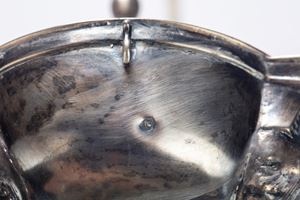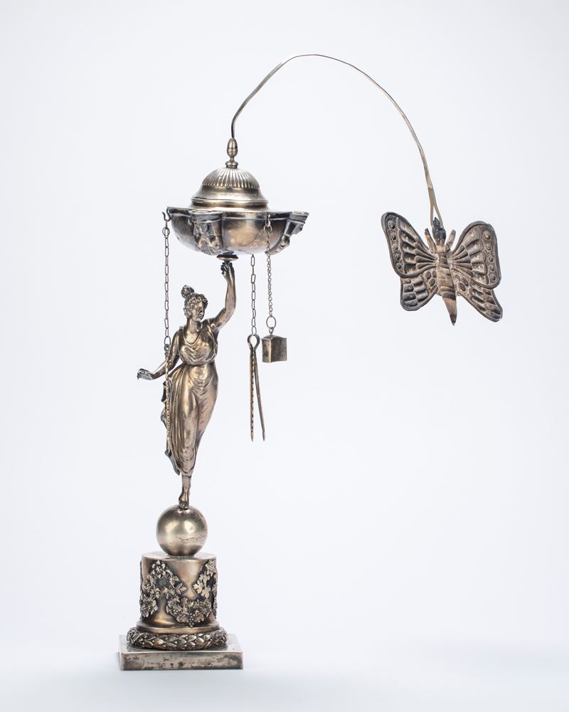 in argentocon figura di vestale centrale poggiante su sfera cesellata a tutto tondo che sorregge lucerna a quattro luci con paralume di linea arcuata terminante con ventolina sbalzata a farfalla, base a tronco di colonna cesellato a tralci di vite con uva. (Lievi difetti).