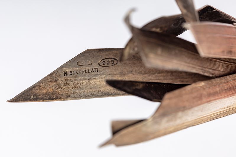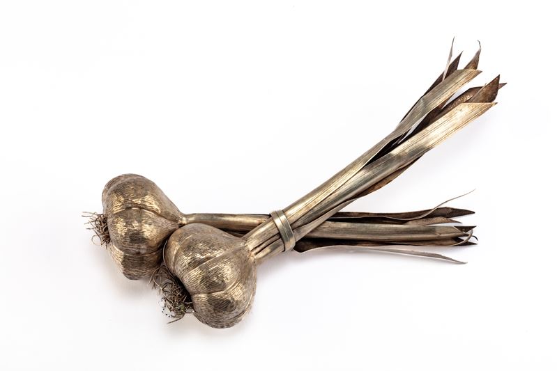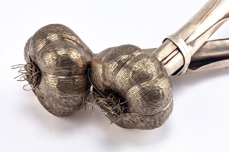 in argento 925a foggia di due teste d’aglio, finemente sbalzate ed incise in maniera realistica con foglie riunite al centro da nastro stilizzato, punzoni all’interno di una foglia, M.Buccellati, 925, 15MI.