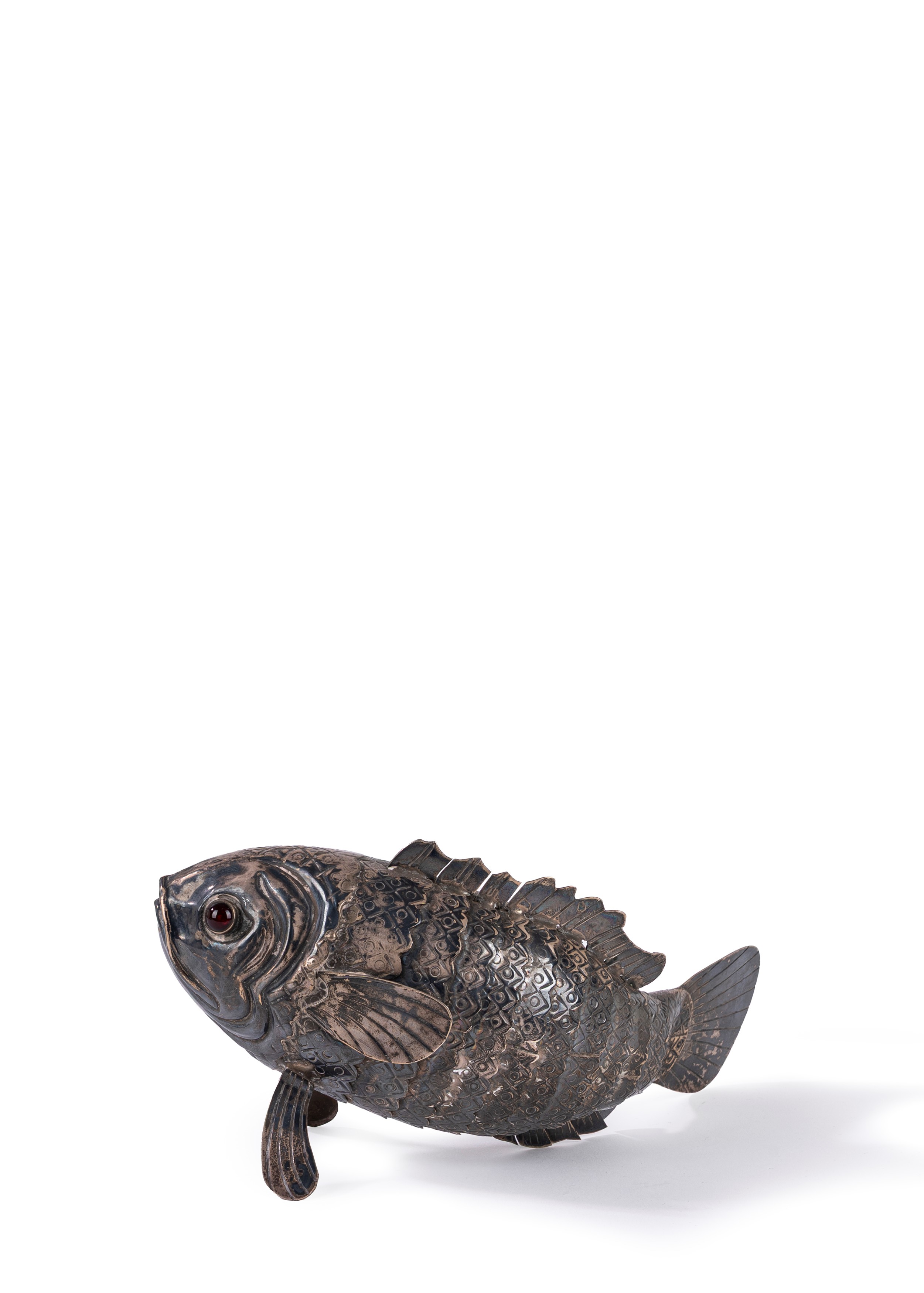 in argentosnodato, corpo inciso a motivo di squame stilizzate, con occhi in paste vitree.